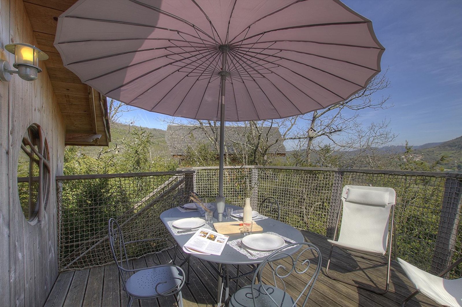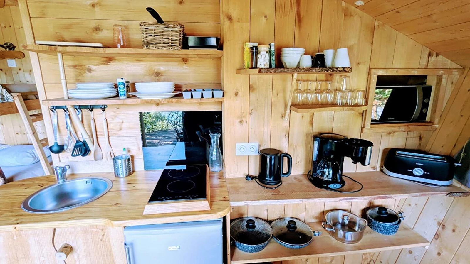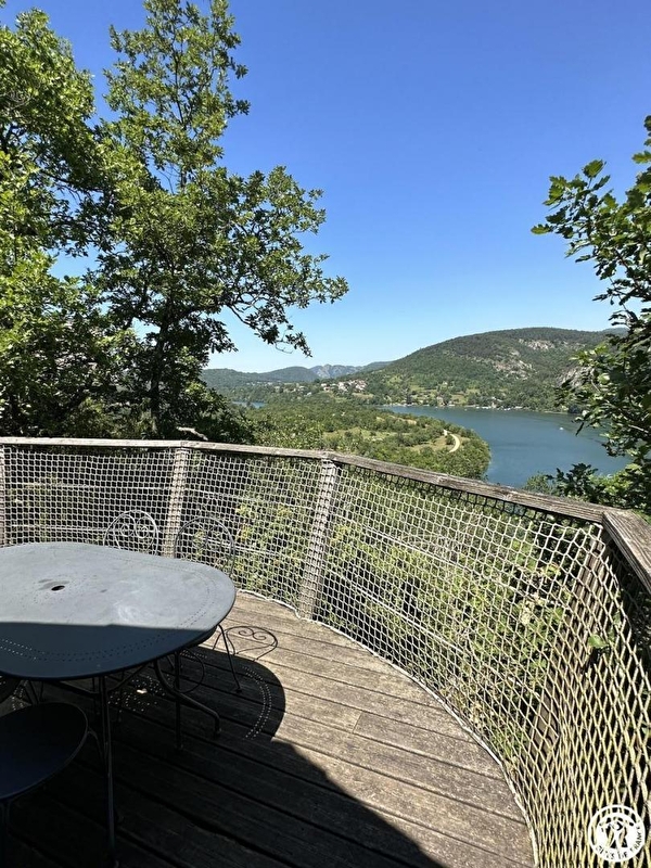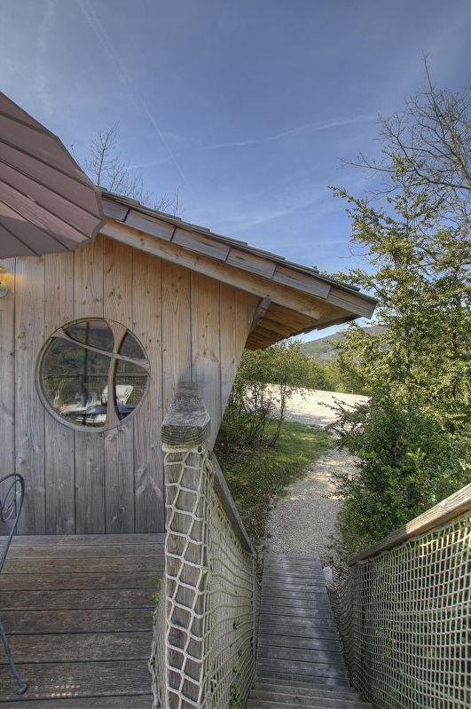 Halfway up, Le Chenaie (23 sq.m. cabin) has, without doubt, one of the finest views of the river Ain. Large wooden staircase up to terrace (15 sq.m.) nearly as big as the cabin itself! The rectangular terrace, in leafy setting with commanding view of river Ain, faces east so is sunny until 2pm. Charming cabin has picture window and 3 separate areas. To right as you enter: dining area with kitchenette (2 ring ceramic hob, fridge, microwave) & lime green 'garden' table. At back: visible sleeping area (single bunk beds) with safety net and to their left an 'invisible' sleeping area for 2 people (fold-down double bed) enabling space to be used for other purposes when bed folded up. Shower room/WC at back of main room.|On arrival you are given a kit of 'basic' products. Best bits: wonderful views from both outside and inside, clever lay-out of cabin, giant porthole over dining area giving the cabin a 'nautical' air, nets around terrace and bunk beds, restful wood décor. Le Chenaie is part of a 'nature' site with total of 7 cabins or lodges which blend perfectly into this forest of box trees in the heights above Serrières-sur-Ain, overhanging the river Ain. Each cabin has its own identity and is built on stilts 2 metres above ground, with totally secure access and terraces. Outstanding location in the Ain gorges: canoeing, rowing, swimming.