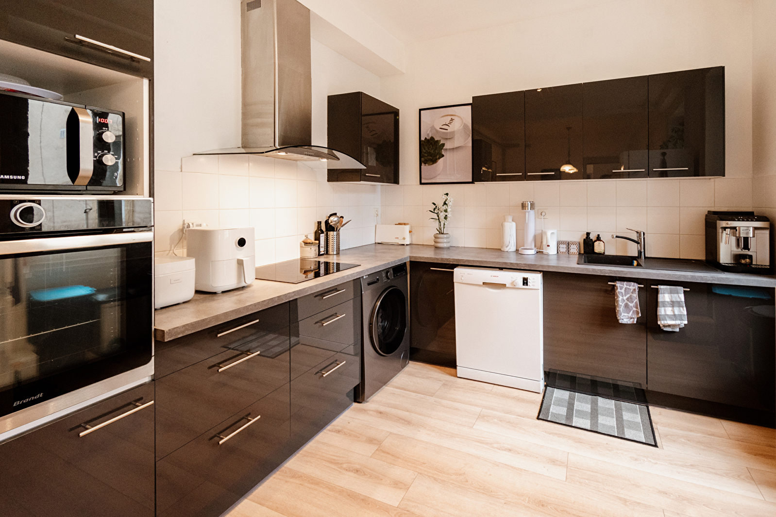 It offers 1 comfortable bedroom, 1 modern bathroom and two large, bright living areas for relaxing or entertaining. Enjoy a video projector for your cinema evenings and a private balcony with views over the town. Every detail has been designed to combine comfort, style and a warm atmosphere, making this flat the perfect place for a city break or business trip.