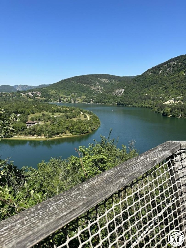 Halfway up, between La Sapinière and La Fustière, La Genévrière (23 sq.m. cabin) has, without doubt, one of the finest views of the river Ain. Large wooden staircase up to terrace (15 sq.m.) nearly as big as the cabin itself! The rectangular terrace, in leafy setting with commanding view of river Ain, faces east so is sunny until 2pm. Charming cabin has picture window and 3 separate areas. To right as you enter: dining area with kitchenette (2 ring ceramic hob, fridge, microwave) & lime green 'garden' table. At back: visible sleeping area (single bunk beds) with safety net and to their left an 'invisible' sleeping area for 2 people (fold-down double bed) enabling space to be used for other purposes when bed folded up. Shower room/WC at back of main room.|On arrival you are given a kit of 'basic' products. Best bits: wonderful views from both outside and inside, clever lay-out of cabin, giant porthole over dining area giving the cabin a 'nautical' air, nets around terrace and bunk beds, restful wood décor. La Genévrière is part of a 'nature' site with total of 7 cabins or lodges which blend perfectly into this forest of box trees in the heights above Serrières-sur-Ain, overhanging the river Ain. Each cabin has its own identity and is built on stilts 2 metres above ground, with totally secure access and terraces. Outstanding location in the Ain gorges: canoeing, rowing, swimming.