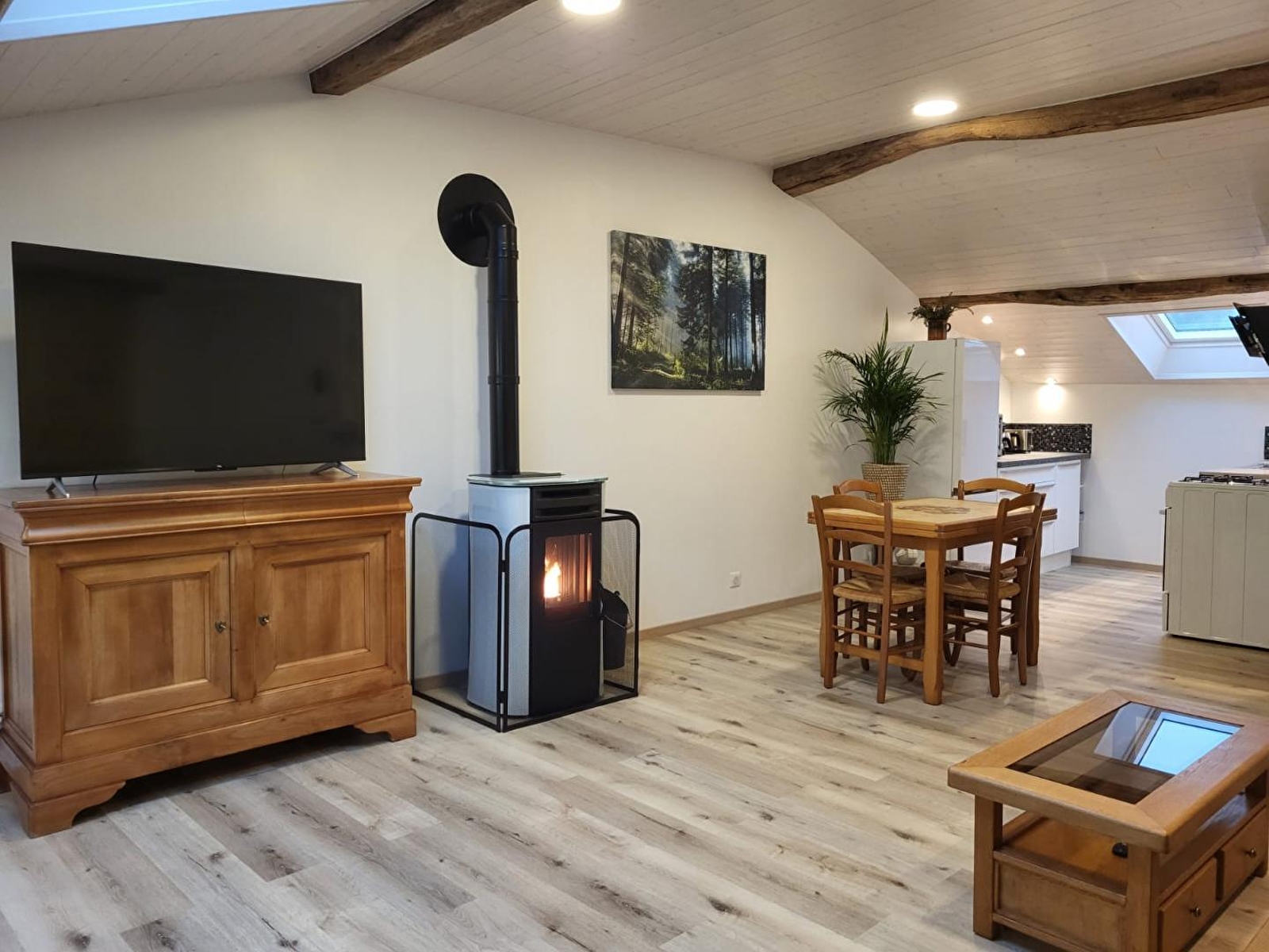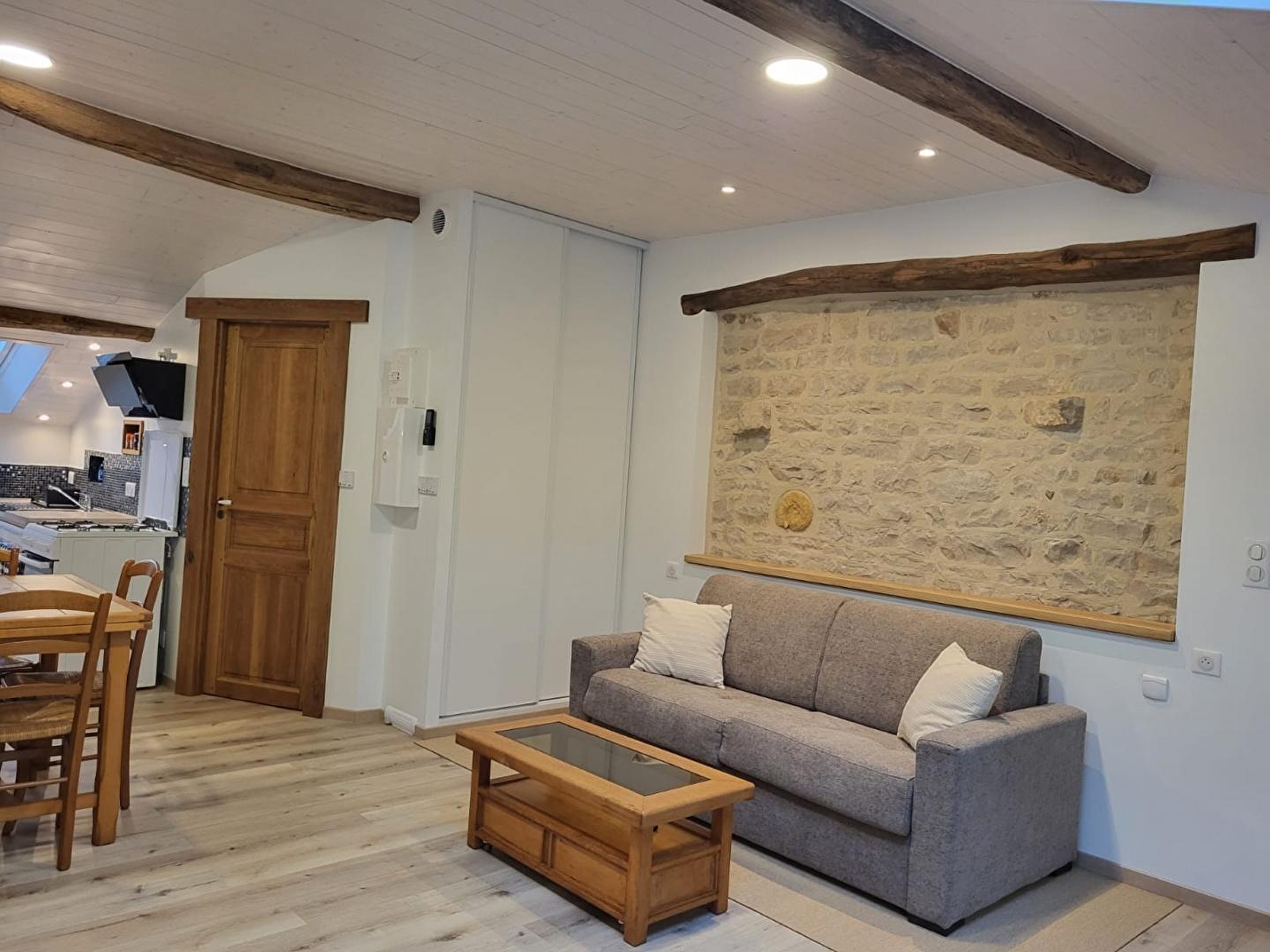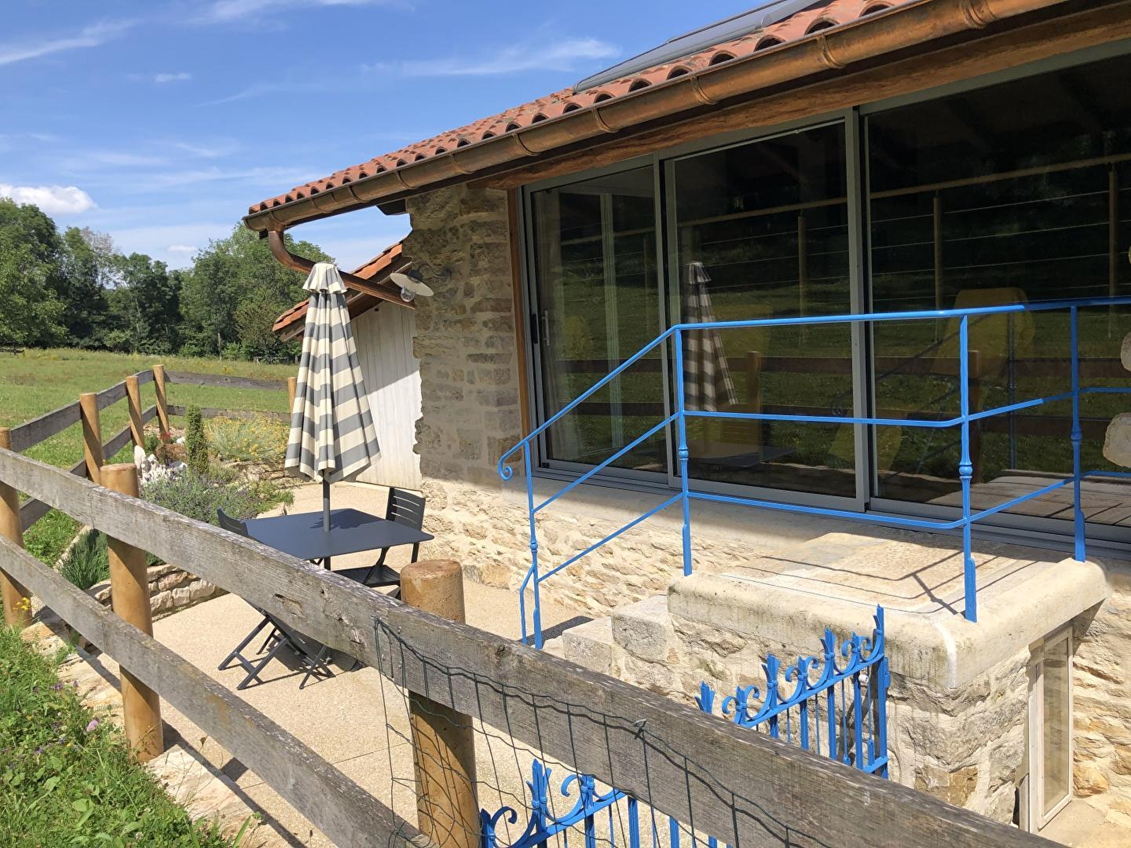 Situated in a hamlet of 50 souls, this gîte is located in a house adjoining that of the owners. Access is via a stone staircase at the back of the house. A blend of the old and the new, this brand-new, well-equipped gîte has been designed by its owner with great attention to detail. The stonework and exposed beams of this farmhouse give this accommodation plenty of charm and a warm atmosphere. It comprises a bright living room with fully-equipped kitchen, sitting room with TV, pellet stove (bags supplied free of charge) and a sofa bed offering additional sleeping accommodation for 2 people (140*190), a bedroom with 1 double bed 140*190 and a shower room with shower and WC. A loggia with 2 deckchairs, ideal for reading and relaxing, with a view over the vast horse pasture, is the perfect place to recharge your batteries in the heart of nature. Outside, you can enjoy a terrace equipped with garden furniture and a plancha. Car and/or motorbike shelter. Ideally located for lovers of cycling, walking and horse riding. You can also explore the forests, lakes and waterfalls and drive 40 minutes to Bourg-en-Bresse to visit the famous Brou royal monastery. A number of local producers and the Nantey cheese dairy are also close by, so there's plenty to tantalise your taste buds!