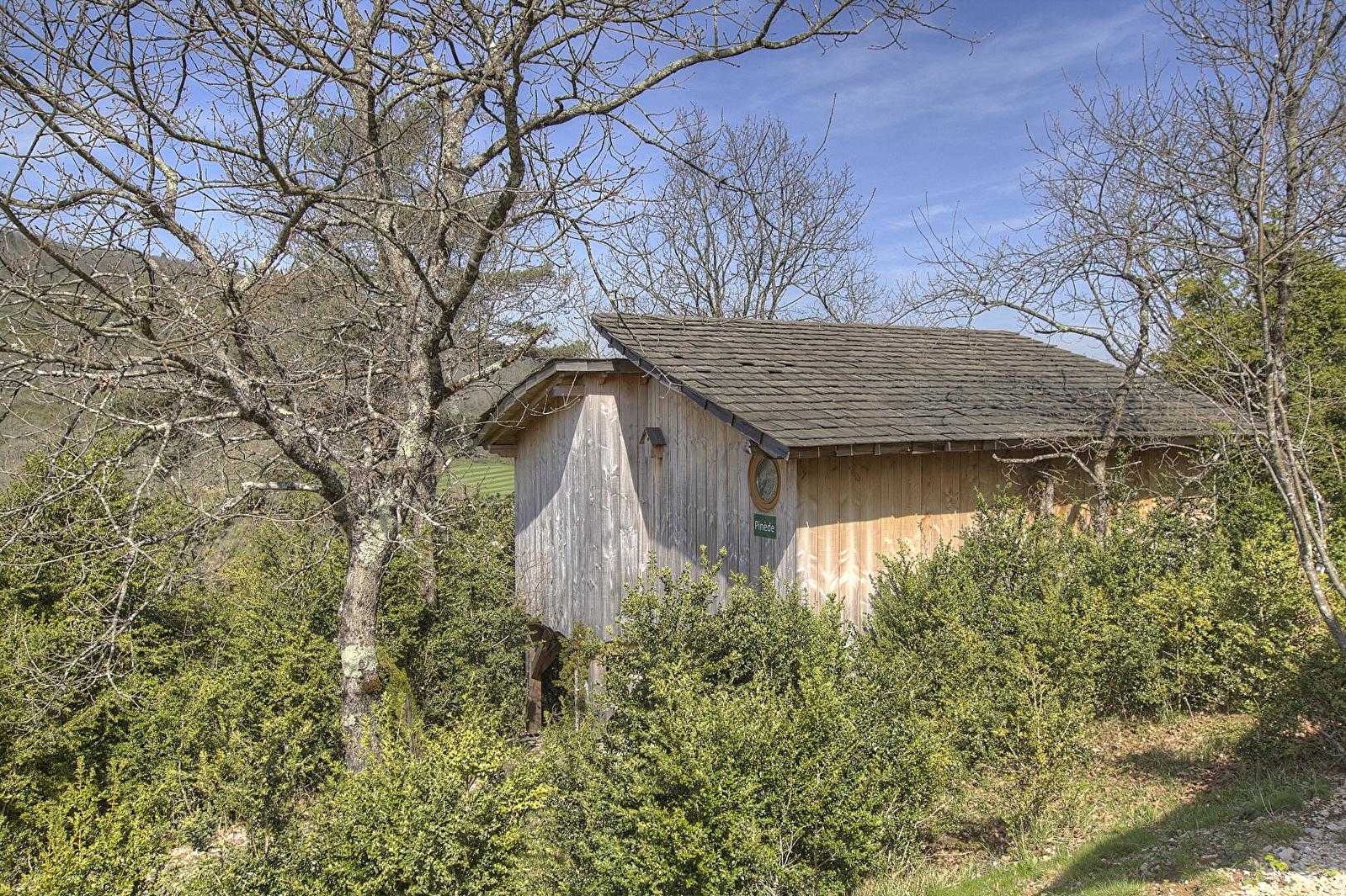 La Pinède has an intriguingly 'hidden' location halfway up the mountain. Its entrance (partly concealed) leads to a cabin (22 sq.m.) by means of a 'footbridge' at same level as the terrace (13 sq.m.) with panoramic view of river Ain and Ile Chambod. This rounded terrace, a kind of outdoor living room with dining area and deckchairs, faces west so has sun from noon to evening. Main room (large picture window opening onto terrace) with dining area (red bench) and kitchenette (2 ring ceramic hob, microwave oven, fridge). Private bedroom (150cm wooden bed for 2 people). Shower room & WC accessed via main living room where it is possible to have an extra bed.|On arrival you are given a kit of 'basic' products. 'Breakfast basket' can be delivered every morning, on request. Best bits: terrace, view (of course) and light filled rooms (all have windows). La Pinède is part of a 'nature' site with total of 7 cabins or lodges which blend perfectly into this forest of box trees in the heights above Serrières-sur-Ain, overhanging the river Ain. Each cabin has its own identity and is built on stilts 2 metres above ground, with totally secure access and terraces. Outstanding location in the Ain gorges: canoeing, rowing, swimming. Walking/hiking on the cliffs: GR (long distance footpath) and PR (local footpaths). Get up early and with luck and patience you may see chamois grazing on the dry turf.