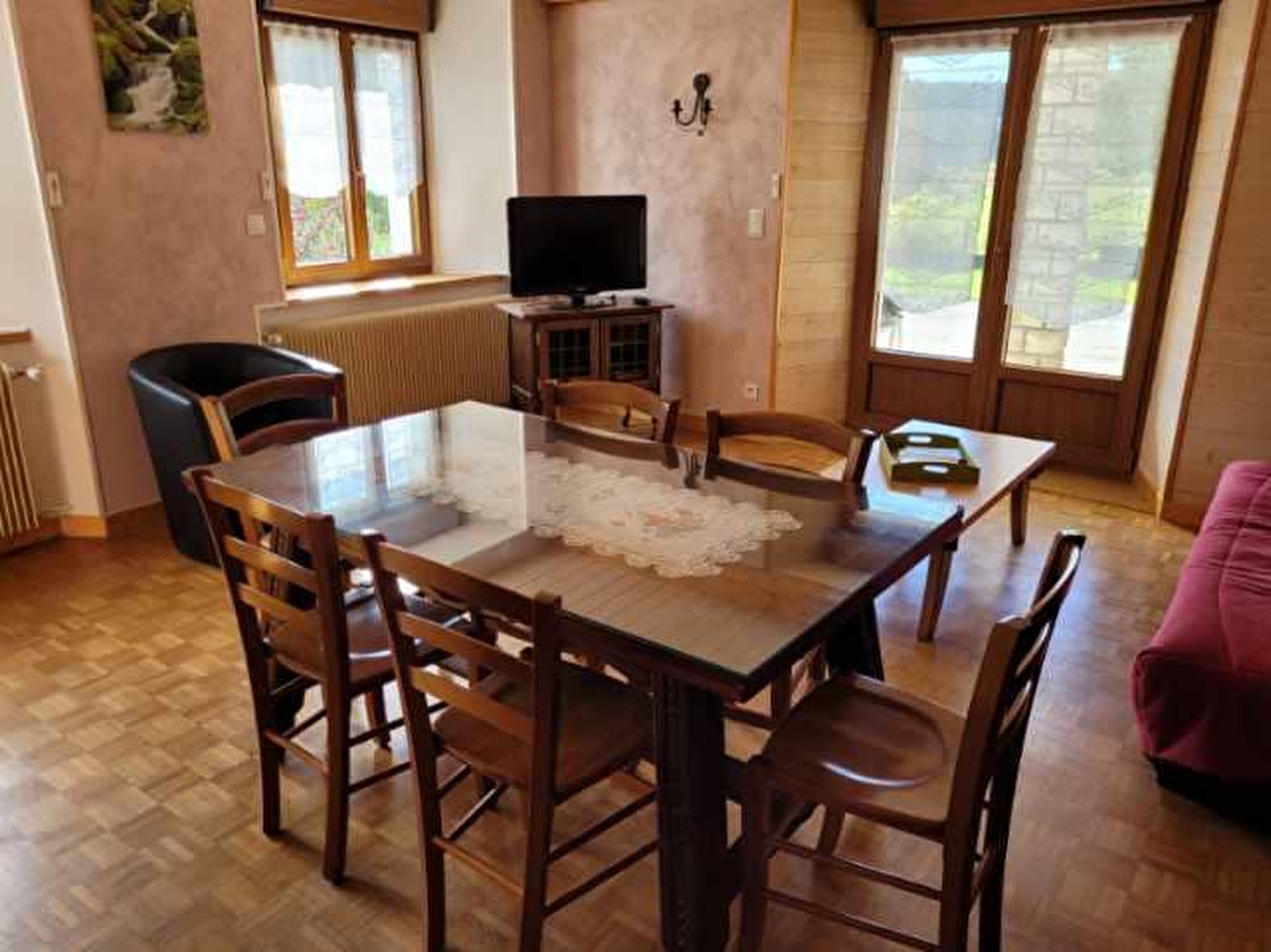 Situated in the heart of the Parc Naturel du Haut Jura, this vast house with its old-world charm is home to a very comfortable gîte. This renovated former farmhouse dating from 1698 is the perfect place to spend a pleasant stay close to nature. Sleeping 6 to 8 people, the gîte comprises a fully-equipped kitchen, living room, bathroom and separate toilet on the ground floor. On the first floor you will find:CH1: 1 bed 140, 1 bed 90 and a bathroom (separate toilet), and Ch2: 1 bed 140, 1 bed 90. On the terrace equipped with garden furniture with barbecue, you can contemplate a pleasant landscape of greenery in the quiet countryside.