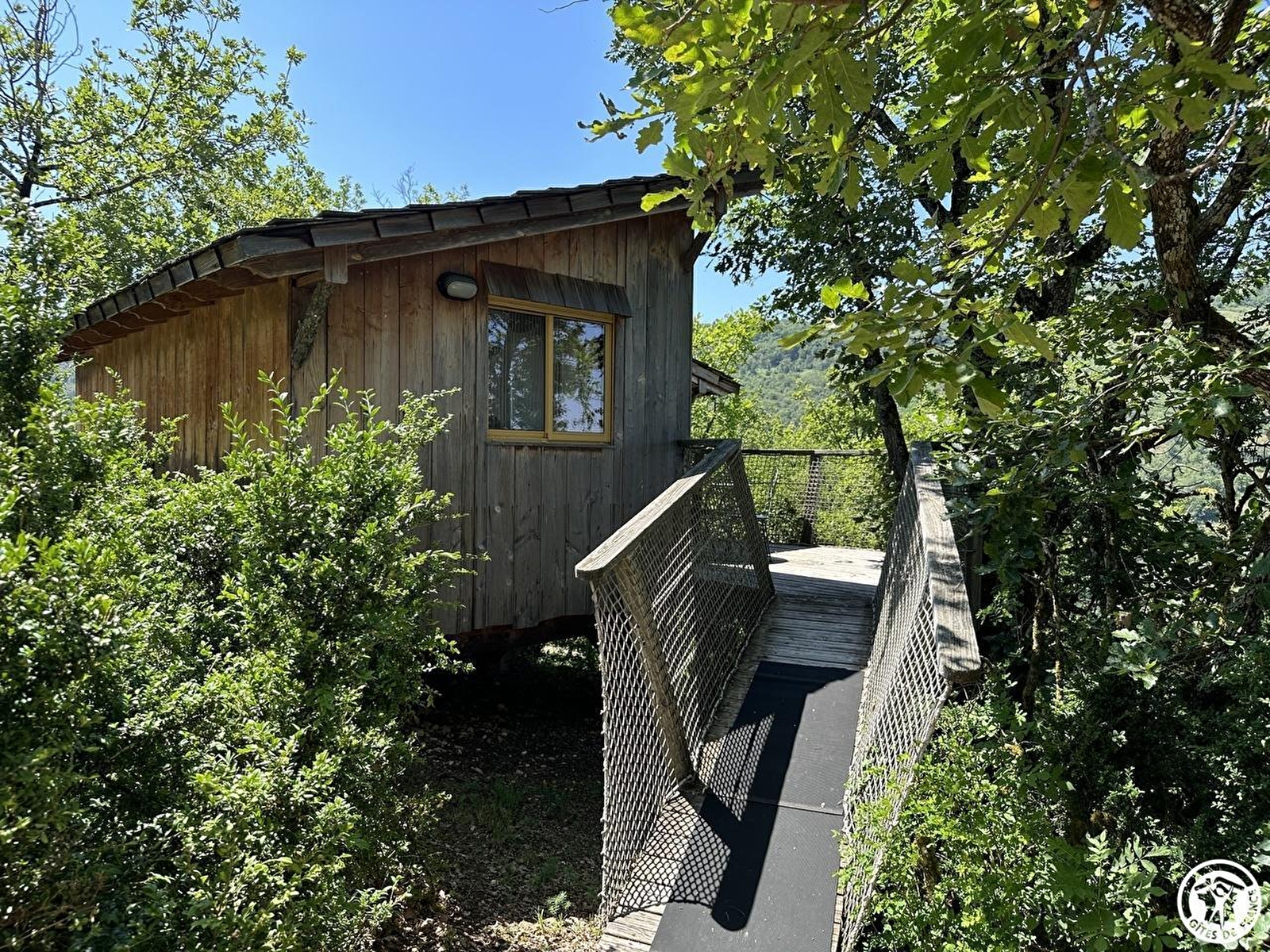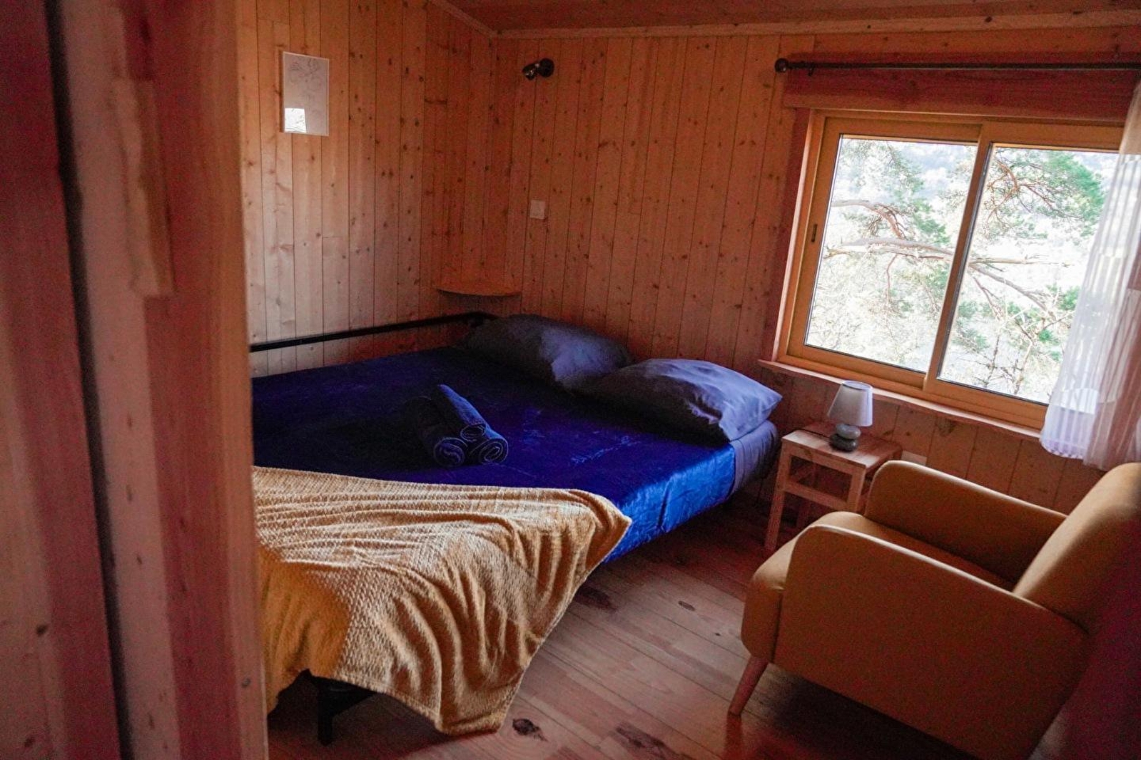 Extra bed possible in living room. On arrival you are given a kit of 'basic' products. 'Breakfast basket' can be delivered every morning, on request. Best bits: terrace, view (of course) and light filled rooms (all have windows). |La Sapinière is part of a 'nature' site with total of 7 cabins or lodges which blend perfectly into this forest of box trees in the heights above Serrières-sur-Ain, overhanging the river Ain. Each cabin has its own identity and is built on stilts 2 metres above ground, with totally secure access and terraces. Outstanding location in the Ain gorges: canoeing, rowing, swimming. Walking/hiking on the cliffs: GR (long distance footpath) and PR (local footpaths). Get up early and with luck and patience you may see chamois grazing on the dry turf