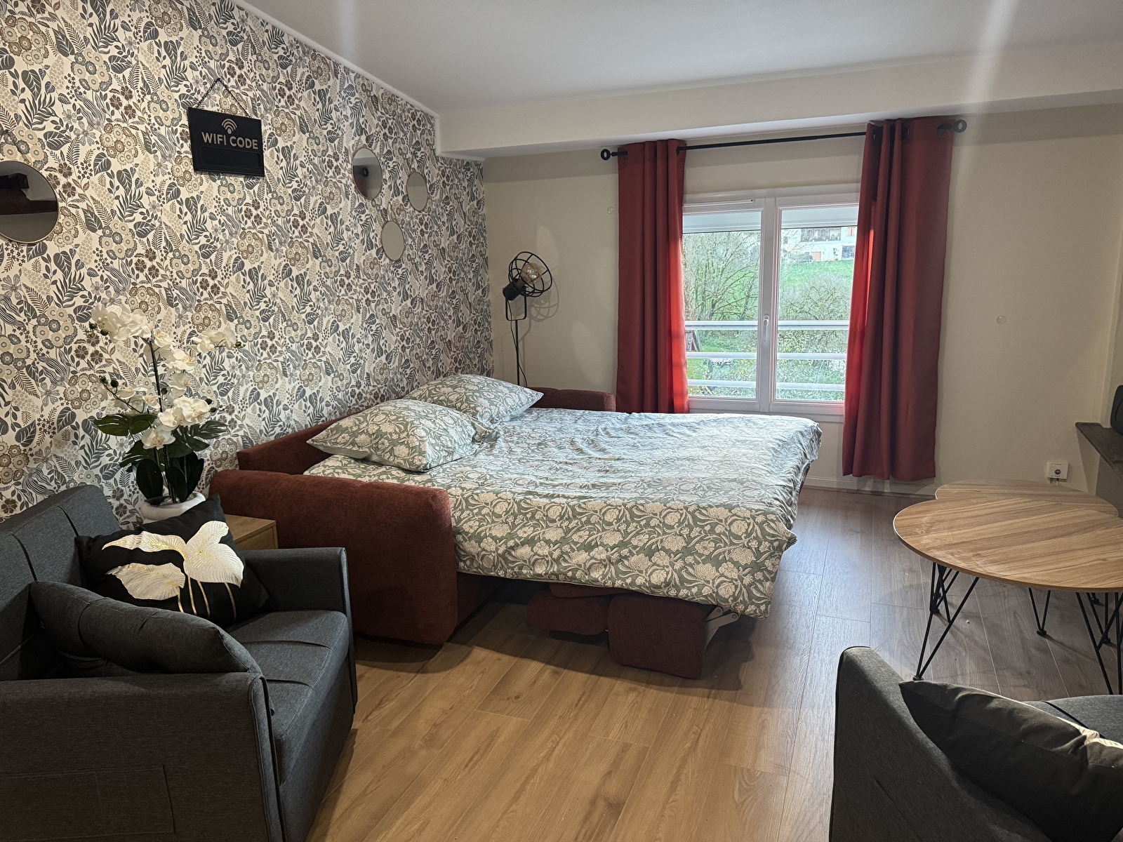 The living room features a sofa bed, TV and fiber optics.