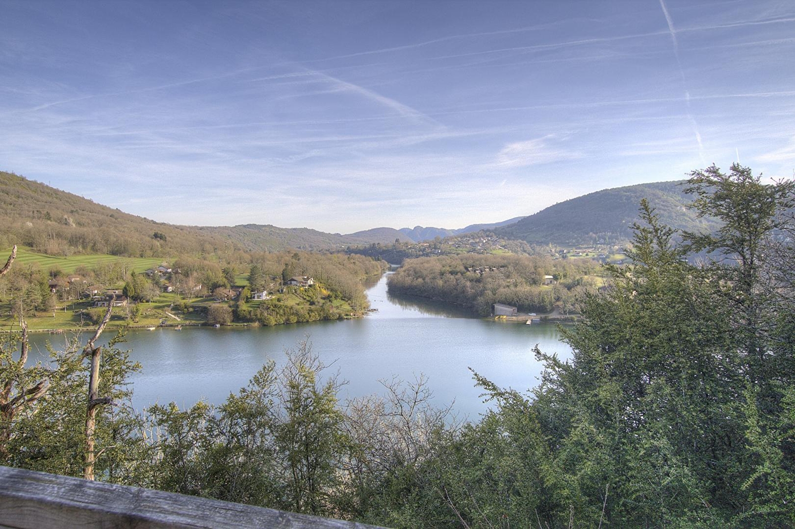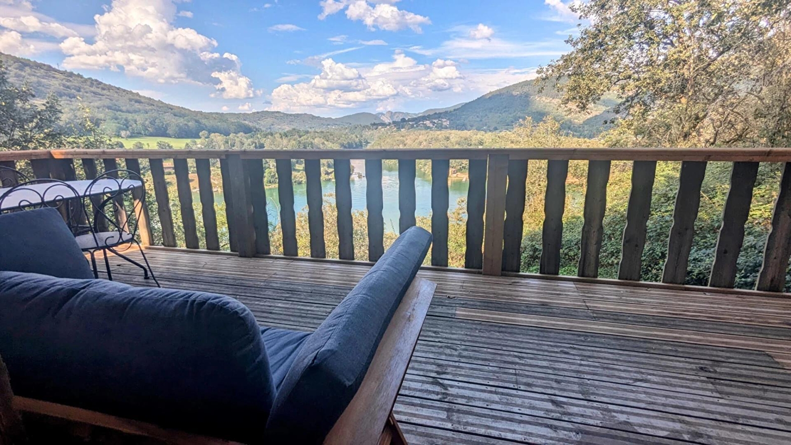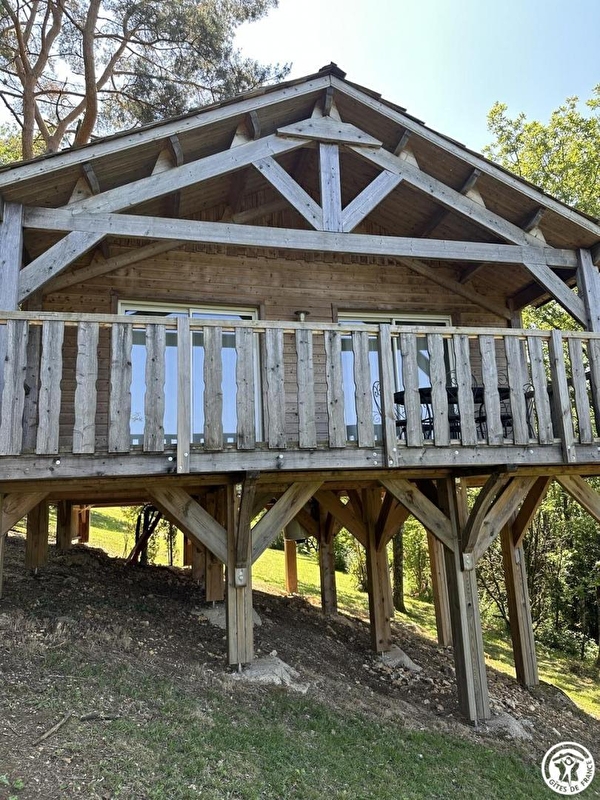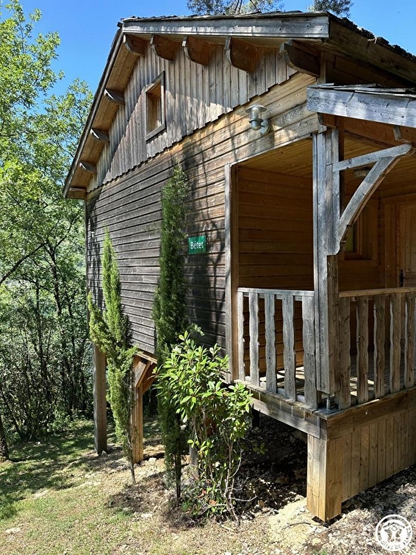 Some distance from other cabins in La Pinède, this lodge (50 sq.m.) is on two levels. Le Betet is accessed via same level 'footbridge' leading to interior of lodge. Entry direct into large living room with 2 picture windows opening onto rectangular terrace (17 sq.m.), with commanding view of river Ain, which has sun in afternoon and part of evening. Main room with spring green décor has 'garden-style' dining area and at night becomes a sleeping area with 150cm wide fold-down bed for 2 people, 'hidden' in wall cupboard/shelf unit. Open-plan mezzanine (narrow stairs to access) is cosy private space (2 single beds) even though it overlooks living room. Below mezzanine stairs: practical kitchenette (2 ring ceramic hob, small fridge with freezer compartment, microwave). Shower room off living room.|On arrival you are given a kit of 'basic' products. Le Betet is also part of a 'nature' site with total of 7 cabins or lodges which blend perfectly into this forest of box trees in the heights above Serrières-sur-Ain, overhanging the river Ain. Each cabin has its own identity and is built on stilts 2 metres above ground, with totally secure access and terraces. Outstanding location in the Ain gorges: canoeing, rowing, swimming. Walking/hiking on the cliffs: GR (long distance footpath) and PR (local footpaths).