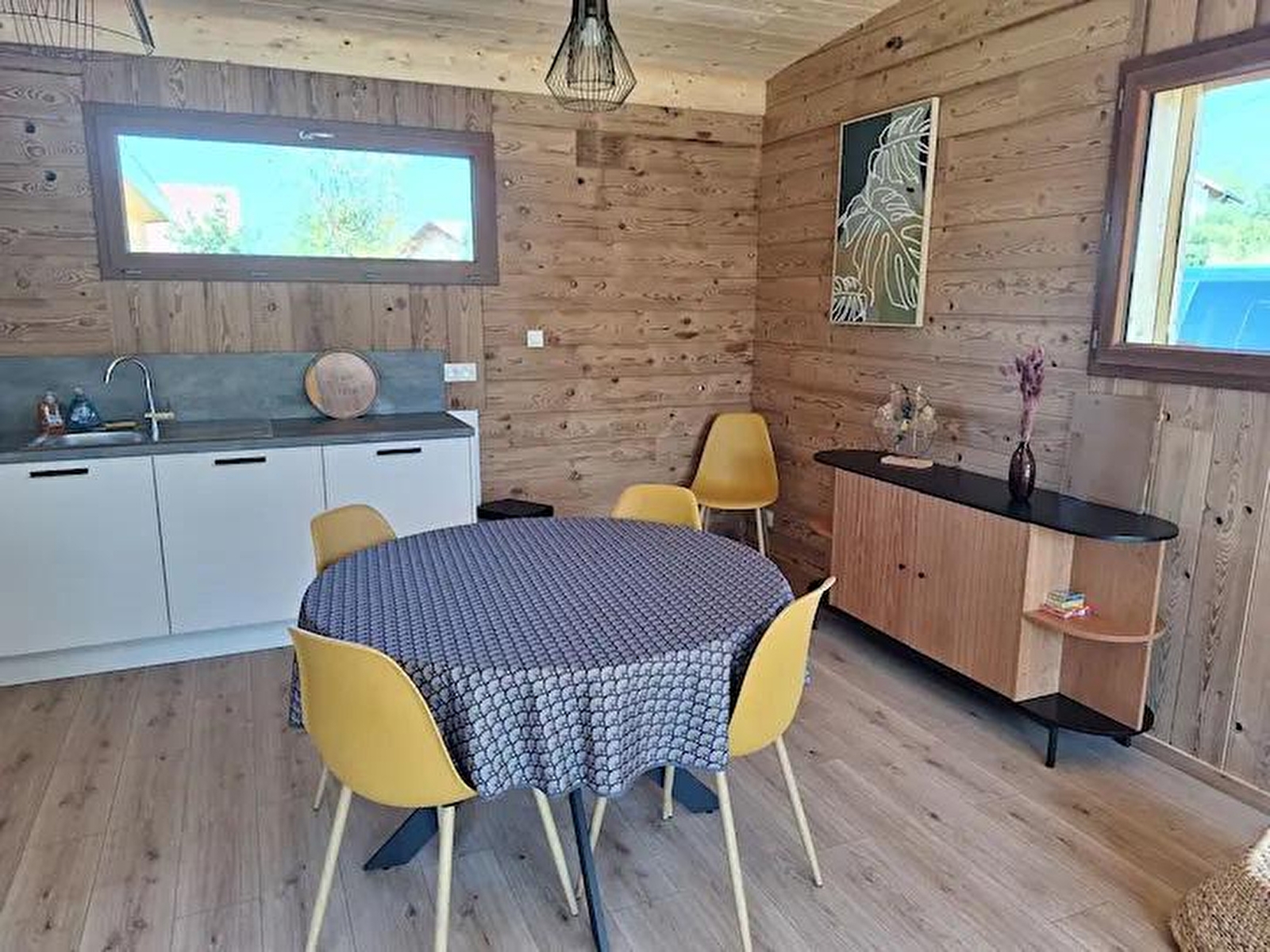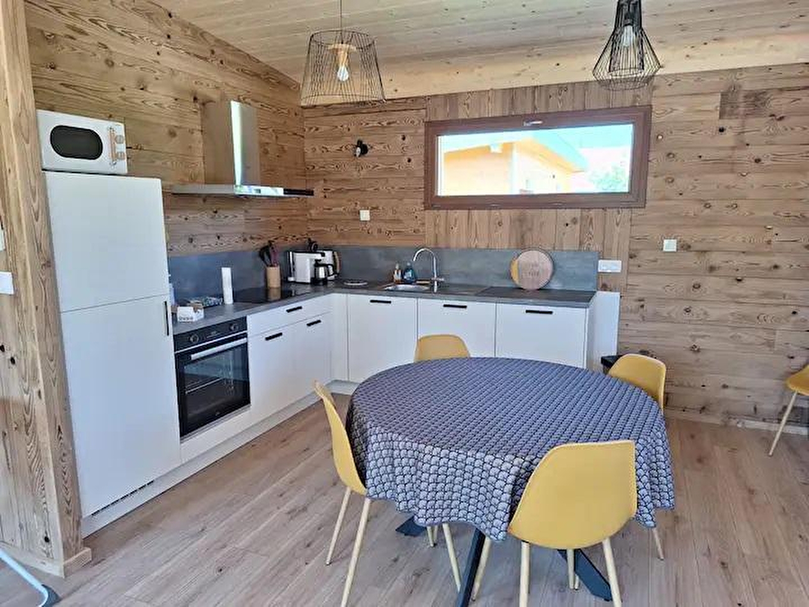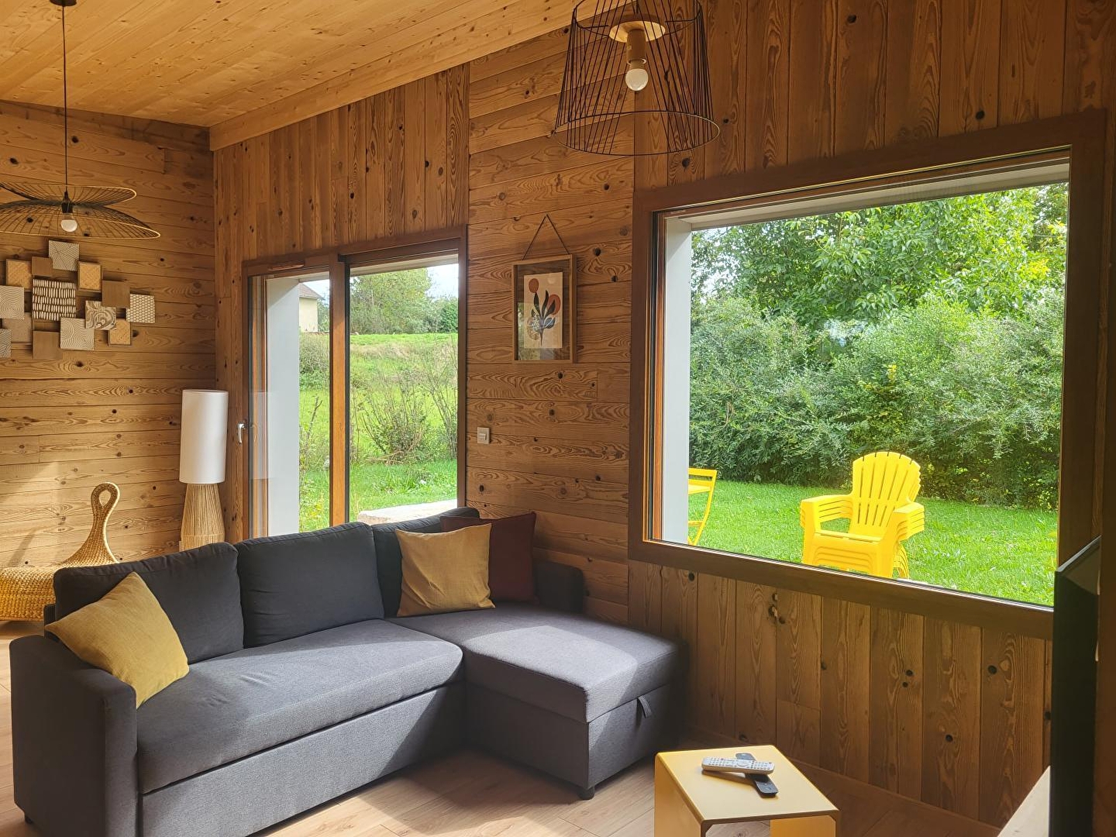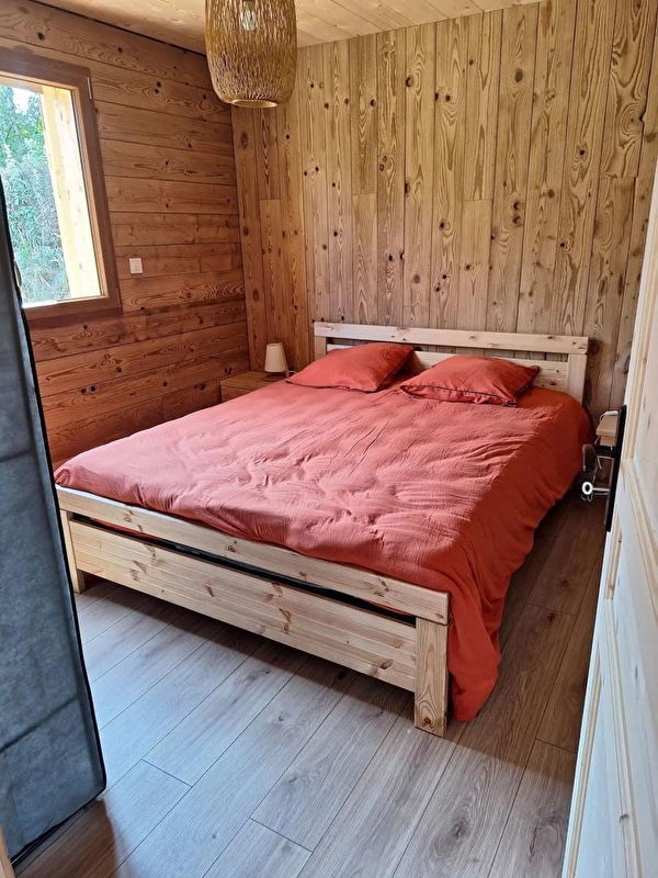 This new timber-frame house, located close to the Pays des Lacs region, comprises a living room with a fully-equipped kitchen, a sitting area with TV, a bedroom with a double bed (160*200), a bedroom with 2 single beds (90*200), a separate toilet and a shower room. Outside, you can enjoy the sunny days on the terrace, equipped with garden furniture, deckchairs and barbecue. Note: At the time of departure, the chalet must be clean and tidy, the dishwasher must be emptied, the dishes put away, the rubbish in the outside bins (blue bin for recyclables, grey bin for bags), the glass in the glass bin (at the crossroads on the left, then straight on about 100 m after the 2nd crossroads) and the kitchen area must be clean and tidy. You will be asked to pay a deposit of 30 euros for cleaning the kitchen area. ATTENTION: the sockets do not comply with standards for charging electric vehicles. It is strictly forbidden to use them for this purpose. Risk of short circuit or fire. A fast-charging station is available 200 m away (contact us). Another gite is located next to this one, also for 4 people, and can be booked together.
