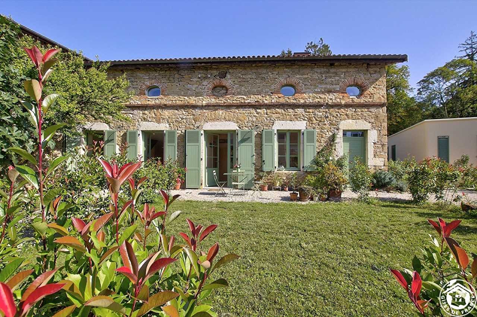 Through a large gate, you enter a large property planted with trees and comprising the owners' house with 3 guest rooms and their adjoining Hauterive and Varey gîtes, to create a single gîte. A separate entrance leads to the living room, where the wood ambiance blends harmoniously with the soft, uncluttered decor and vintage touches. From the living room, a staircase leads to the shower room, separate toilet and two bedrooms of your choice: one with pink tones (a 190*200 bed) overlooking the garden and park, and the other with two single beds (2*90*200), two bull's-eyes and a roof window. On the ground floor, a connecting door leads to the living room of the second gîte, decorated in vintage style and featuring a fully-equipped kitchenette, dining area and lounge. A beautiful wooden staircase takes you up to the 1st floor, where you'll find a master bedroom with a 180*200 bed (separable into two 90*200 beds) and a shower room with small green mosaics and an integrated but independent toilet. The gîte is air-conditioned with reversible floor heating and a heat pump. All-inclusive - beds made up on arrival. Two private north- and south-facing terraces. In this large wooded park, you'll find a small "beach" on the banks of the Oiselon, a small stream running through the property, where you can enjoy the peace and quiet. The owners offer guests two swimming pools: an outdoor pool and an indoor lap pool, located in their main house, as well as a fitness area (cardio and weight training). Discover the Jujurieux silk industry or the Ambronay festival and its baroque concerts.