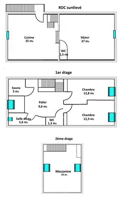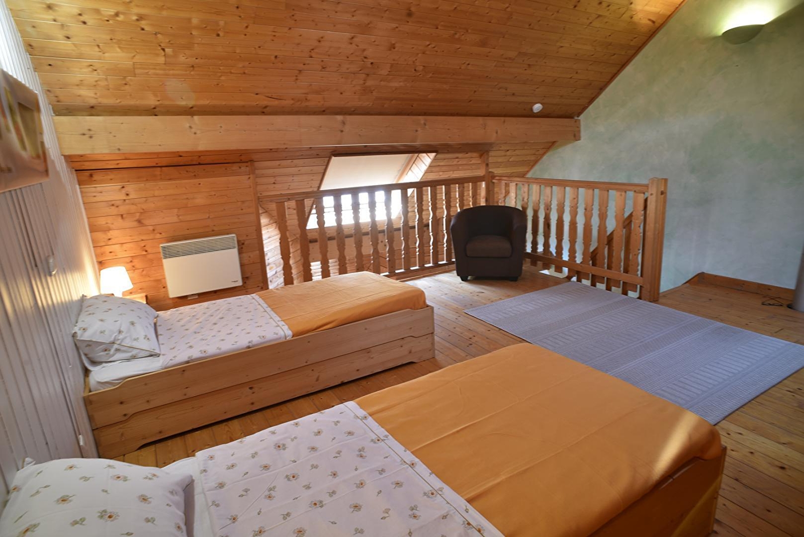 Upstairs are 2 bedrooms, each with a 140x190 bed. On the same level is the shower room and a traditional 4-seater sauna.
