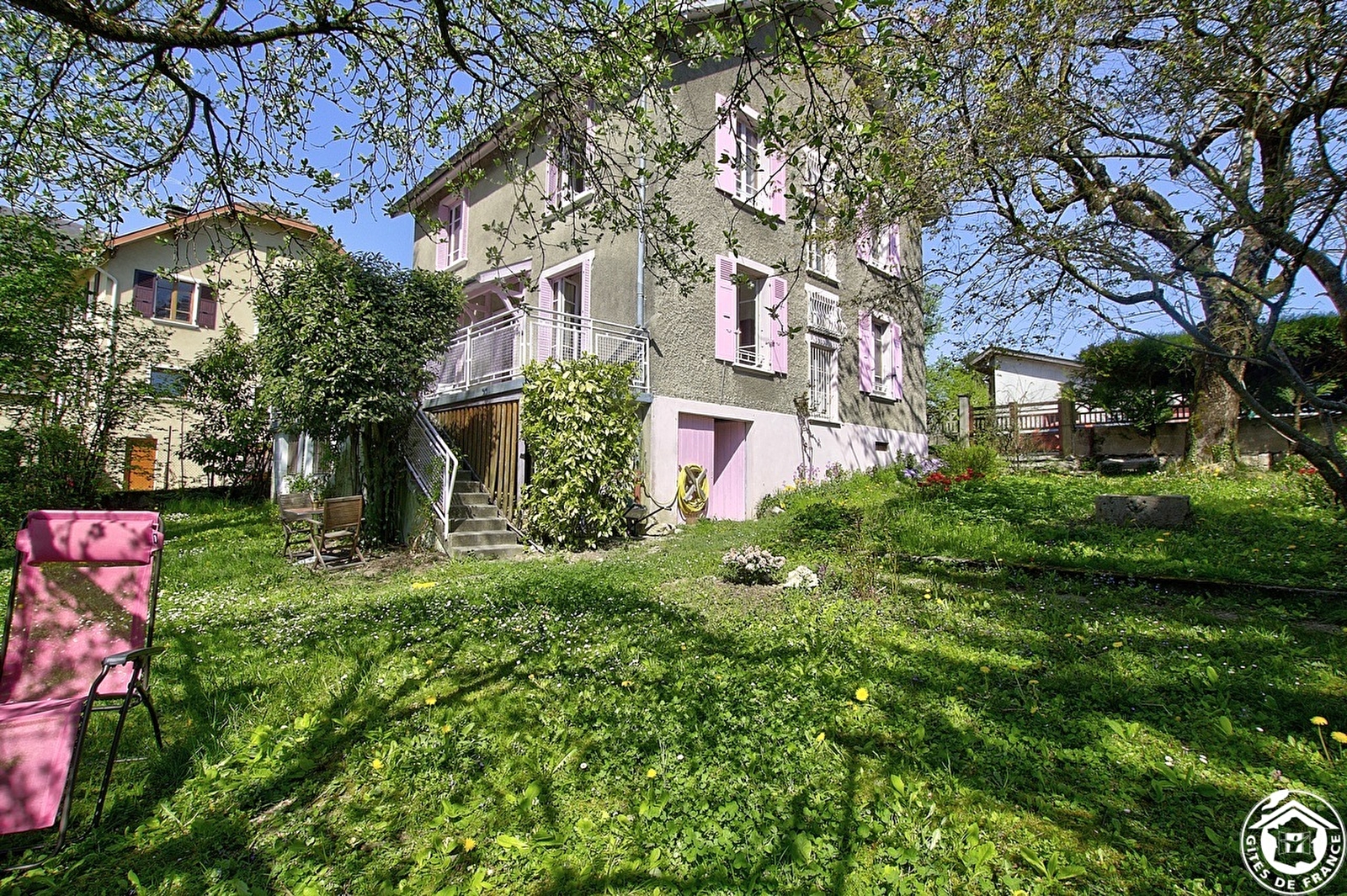Fully renovated family house (250 sq.m.) at foot of the Col de la Biche, in hamlet of Corbonod at heart of Gignez, 5 min. from Seyssel. Accommodation on 3 levels for 14 people - 6 bedrooms, 2 shower rooms, 3 WCs. Charming detached house with pink shutters on gated property. 2 stone steps up to light & airy entrance hall (colourful tiled floor) with doors leading to living rooms. On right: separate fitted kitchen. On left: small TV lounge. Straight ahead: large sitting/dining room (40 sq.m.), perfect for dining with friends or family, with fireplace (ideal for snuggling up and enjoying peace and quiet in winter). Lounge opens onto large, south-facing tiled terrace which is sure to be a hit with people of all ages. Separate WC. 1st floor: parquet corridor leading to 5 bedrooms. Yellow, Pink and Blue rooms (two 80x200cm beds which can joined to form queen-size beds, if required). Mauve room (two 80x200cm beds, 130cm wide bed for 1 person). Small bedroom (100cm wide bed for 1 person) with wrought iron frame. Shower room/WC.|Door in corridor opens onto staircase to 2nd floor (attic): large, light & airy bedroom (80 sq.m.) with four 90x200cm beds, exposed beams, own shower room (walk-in shower), separate WC (wash-hand basin). Cellar (inside and outside access) with utility area (washing machine, tumble drier), space to keep bikes. Fenced garden (BBQ, plancha) will delight the whole family. Central heating. Car can be parked on the property. Single garage.