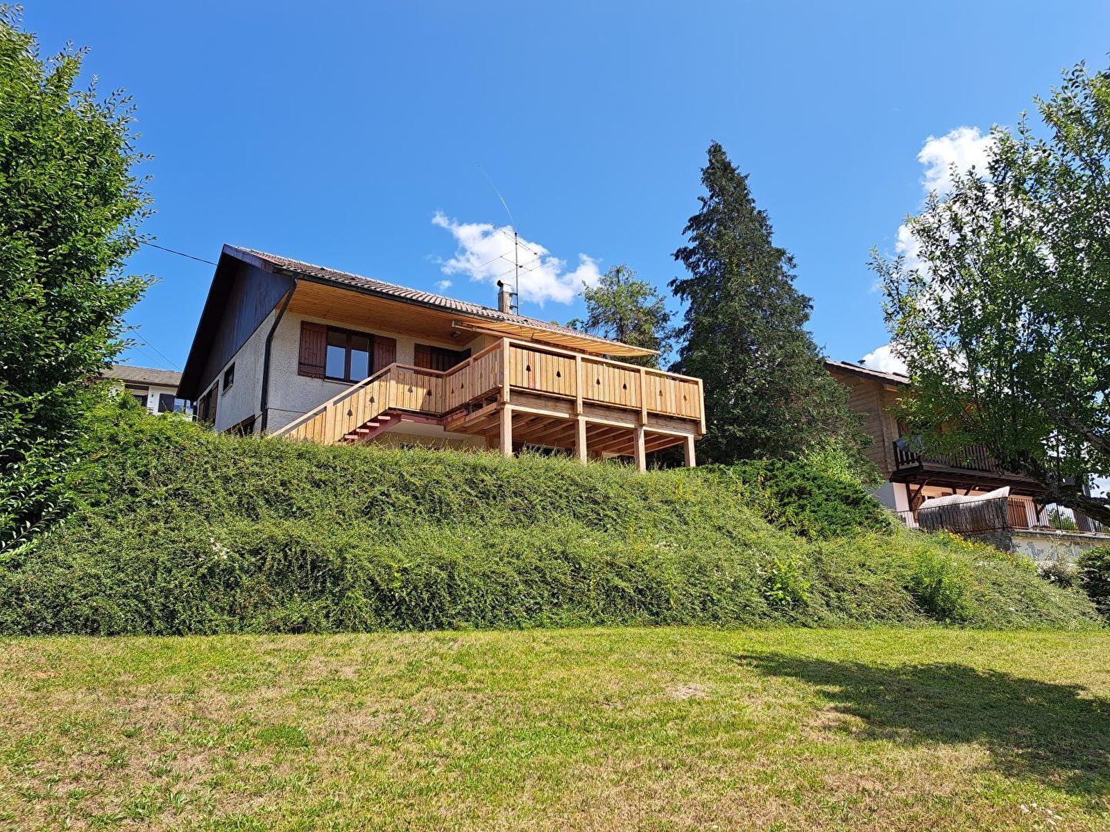 In the heart of the Lake District, this house, set in 1200 m² of enclosed grounds planted with trees, is ideal for a holiday with family or friends. It comprises a living room with a fully-equipped kitchen, a sitting area with sofa, TV and wood-burning stove (provided free of charge), a bedroom with 1 double bed (160*200), a bedroom with 2 electric single beds (90*200), a shower room and a separate toilet. On the garden level, 2 adjoining bedrooms (accessible only from the outside), each with 1 double bed (140*190), a small shower room and WC. Outside, you can enjoy a terrace with a panoramic view of the surrounding countryside, complete with garden furniture, sun loungers and plancha. There's also a patio with a lounge where you can relax in fine weather. Ideally located, 5 km from the Chalain lake and 15 km from the Hérisson waterfalls, you can also reach the Haut Jura in less than 30 minutes. Lovers of leisure activities will also be delighted: hiking, tree climbing, snowshoeing, cross-country skiing, etc. Special electric car recharging point: flat rate of 10kWh/day, beyond which a supplement will be charged (approx. 0.23 cts/kWh).