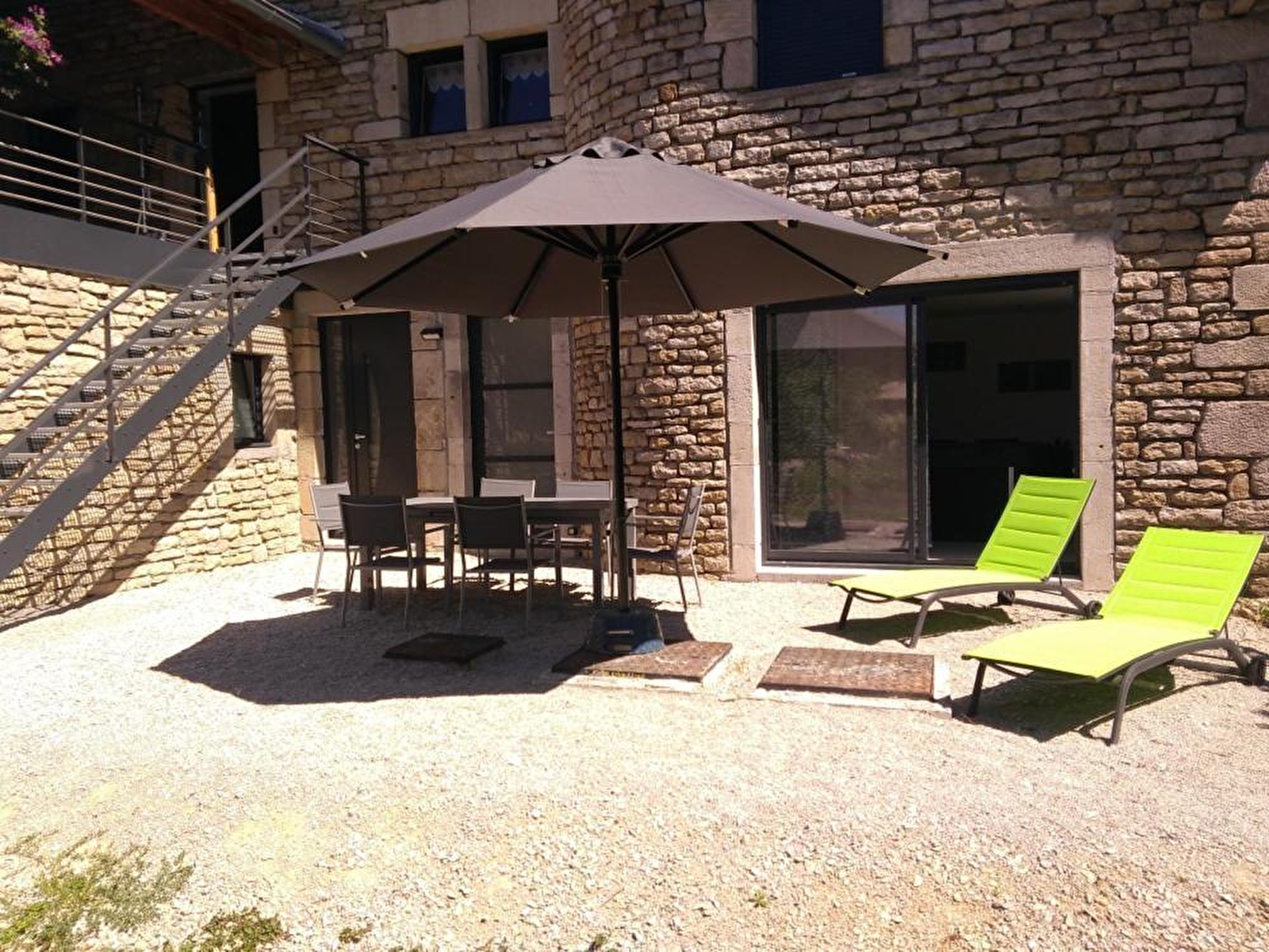 This ground-floor flat in a completely renovated building (another flat is on the 1st floor) comprises a living room with a fully-equipped kitchen, a sitting area with TV, 2 bedrooms each with a double bed (140x190), a shower room and a separate toilet. Outside, there is a terrace with garden furniture, deckchairs and a barbecue. A shared spa is available (€50/stay). Private car park on site. For your comfort, beds will be made on arrival. Possibility of accommodating 1 or 2 extra people on request (sofa bed in the living room). Ideally located, you can discover 2 UNESCO World Heritage sites: the Grand Saline de Salins les Bains and the Saline Royale d'Arc-et-Senans. Nature lovers will not be outdone: hiking, cycling, paragliding, canoeing, kayaking and swimming are all within a 10-minute drive. NOTE: gîte G2512 on the 1st floor can be booked for up to 12 people.