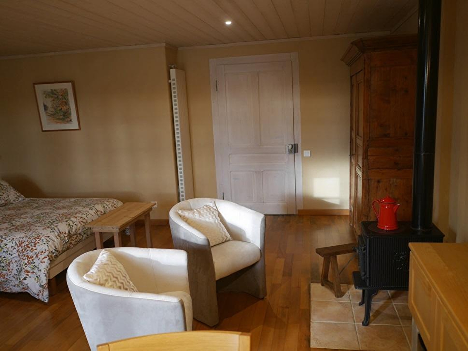 The gîte, ideal for a two-person holiday, is housed in an old Comtoise farmhouse in a hamlet in the Angillon valley, on the first plateau of the Jura, which has been carefully restored using only eco-friendly materials. Facing the rising sun, this single-storey, clay-walled studio has its own independent entrance. Guests will appreciate the calm and serenity of the setting, and the window with its view of the Fresse forest and the start of the Route des Sapins. The location near Champagnole is ideal for exploring exceptional natural sites such as lakes and waterfalls, resurgences, retreats and belvederes, historic sites such as the Salines, and the nearby Doubs with its peat bogs, Loue valley and lakes, all less than three-quarters of an hour away. You'll find a kitchen opening onto a sitting area with a wood-burning stove for your enjoyment, in addition to central heating, separate toilet and shower room, a double electric box-spring bed (140*200), with TV. Linen is provided and all amenities are included! Terrace available, deckchairs can be set up in the shade of the large ash trees in the large garden. Edith and Bruno will be delighted to help you find your way around. Garage for bicycles available. You can also rent another gîte for 2 people in the same building: the Gîte de l'Angillon.