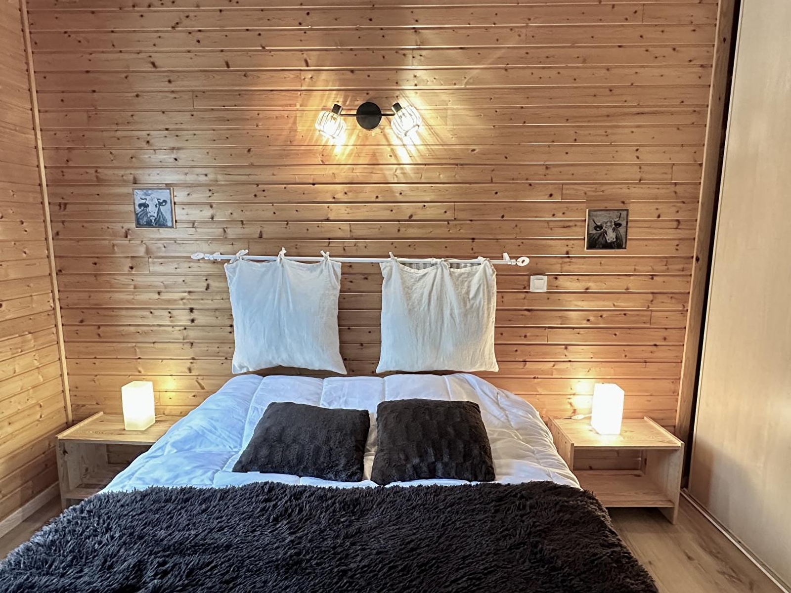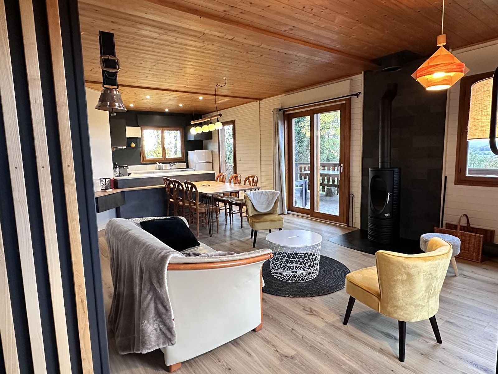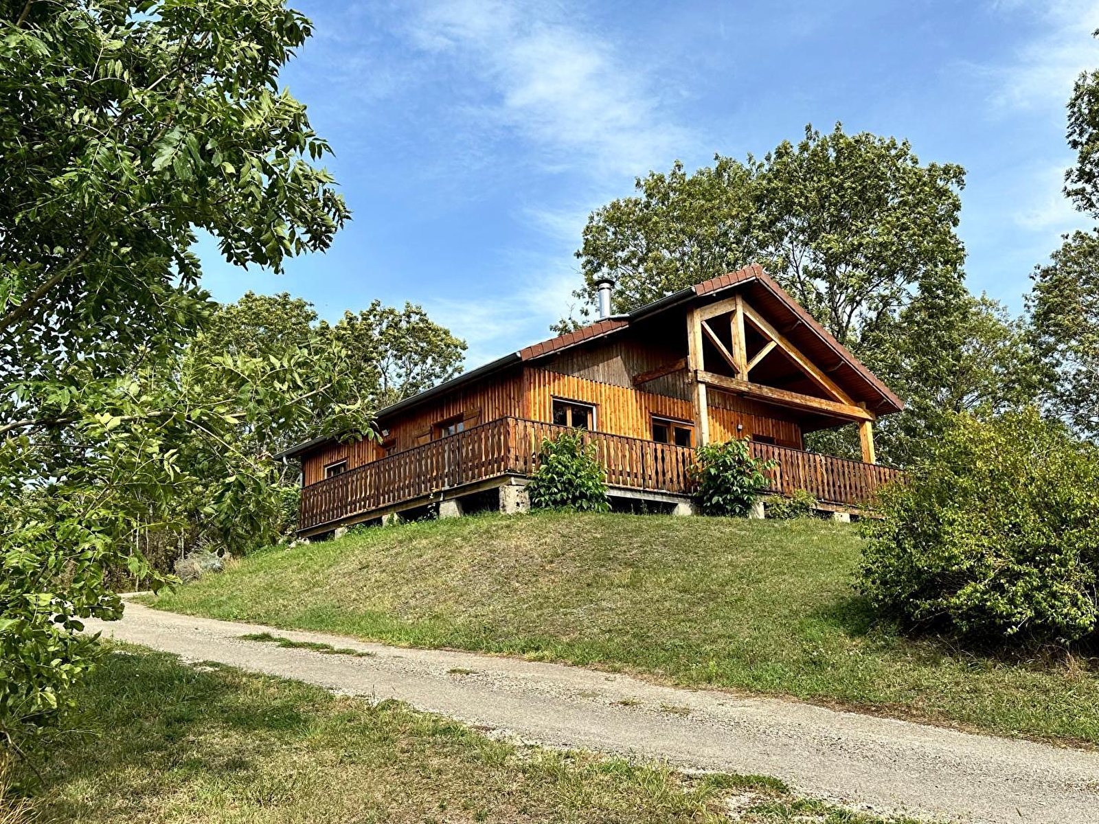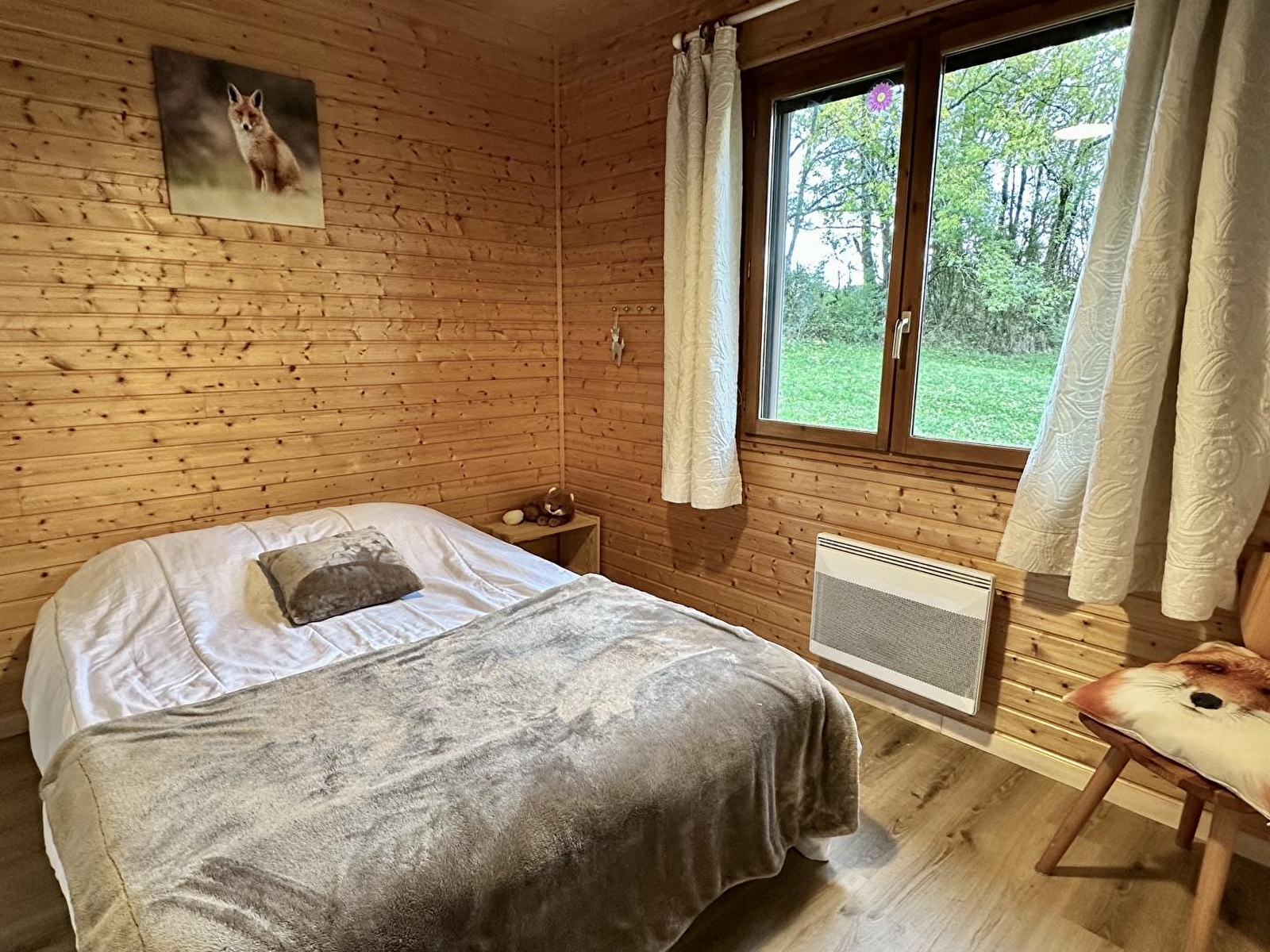 Chalet l'Erythrône comprises a very bright living room where the sun is always shining from morning to evening, with a sitting area comprising 2 sofas and a wood-burning stove, a fully-equipped kitchen (dishwasher, fridge-freezer, microwave, oven, 3 gas rings and 1 electric hob), a very large covered south-facing balcony where you can eat, 3 bedrooms: one with a 160 cm double bed, one with 2 90 cm twin beds and one with 2 90 cm single beds. A bathroom with shower and washing machine and 1 separate toilet. The chalet is located at the end of a private road, with private parking for 2 cars. It adjoins 4 hectares of meadows and woods tended by our 2 donkeys. The chalet can be rented on its own or in addition to our large group gîte 500 m away.
