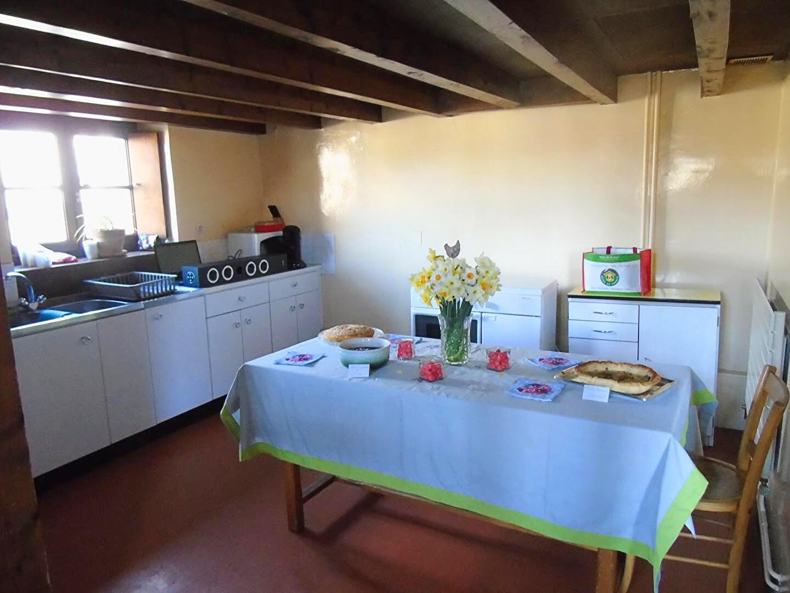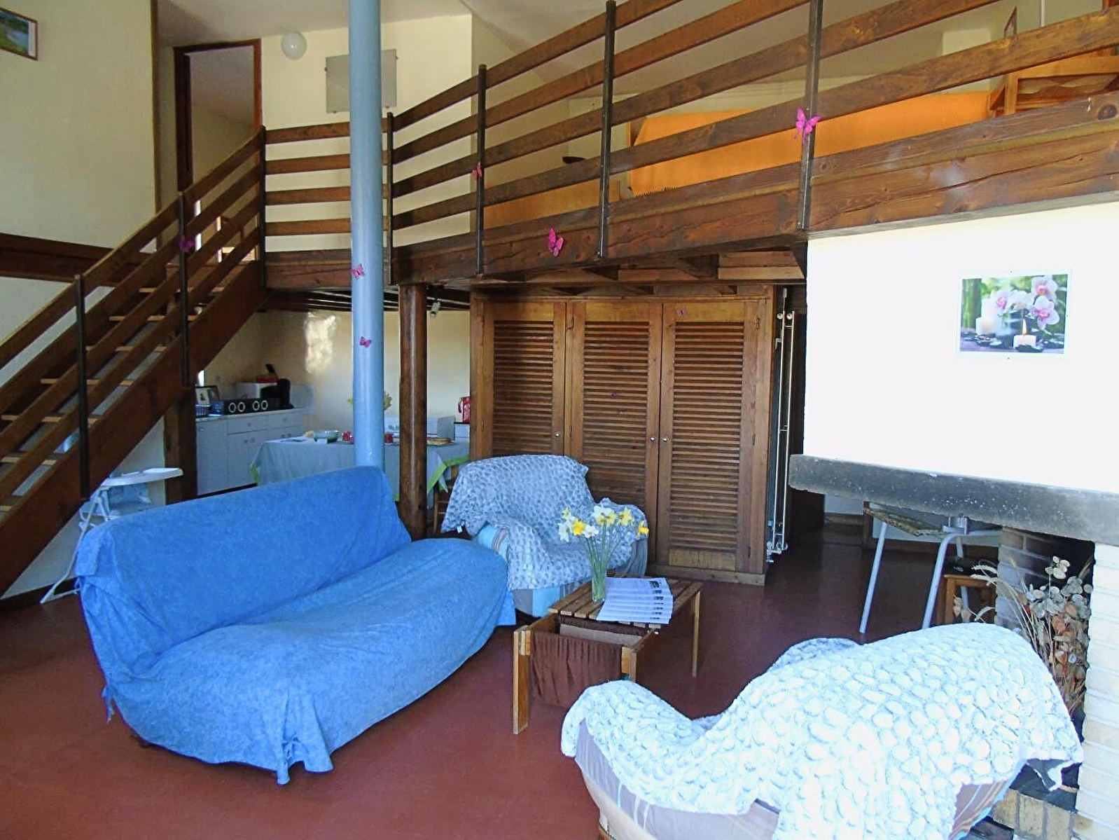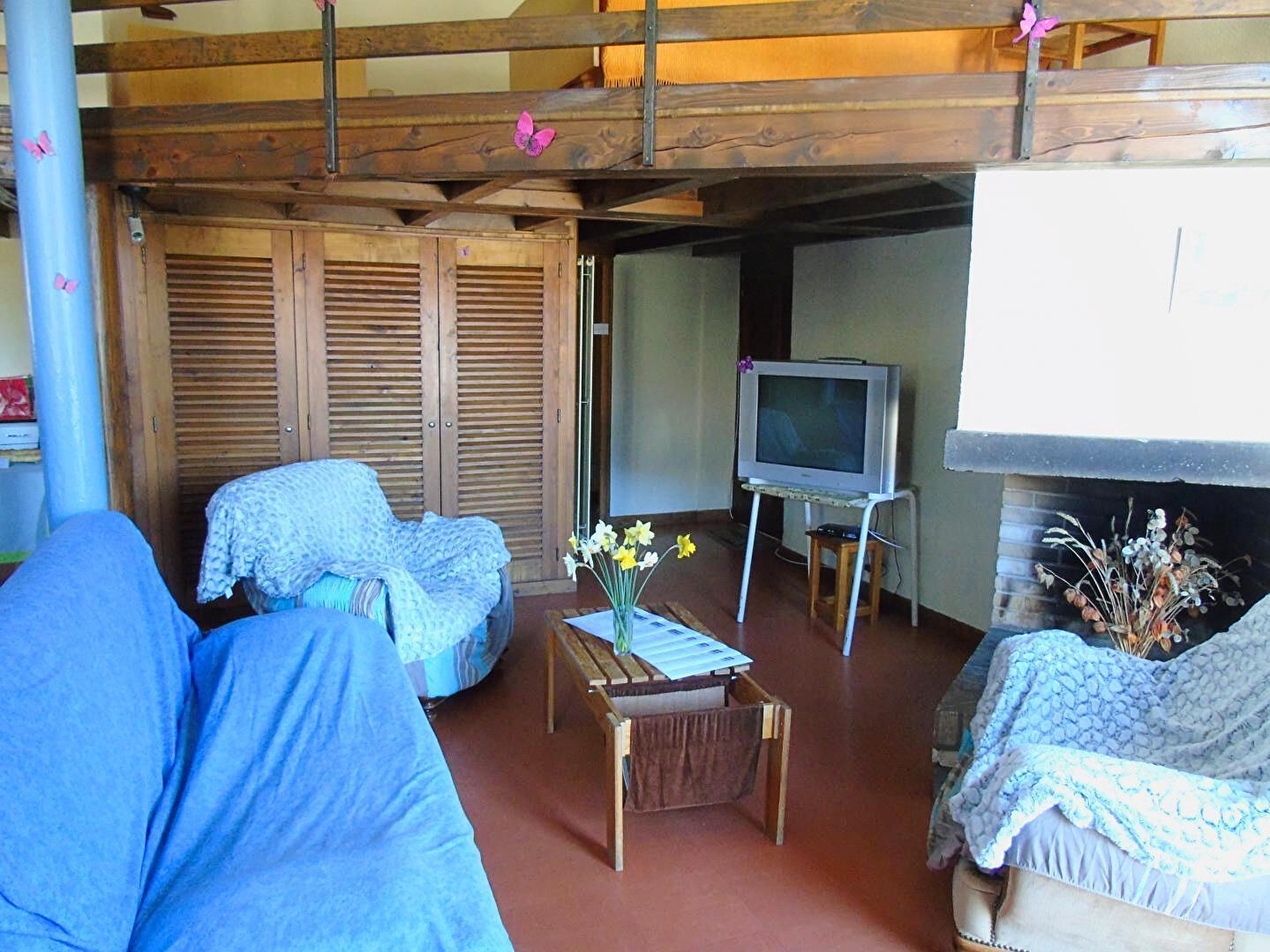 The charming gîte Les Moineaux (70 m²) is divided into two levels. On the ground floor are the living rooms. A living room, an equipped kitchen and a small sleeping area. On the first floor, you will find two bedrooms (double beds) and a mezzanine (3 single beds) and a shower room. Central heating and decorative fireplace only. Shared washing machine in the building.