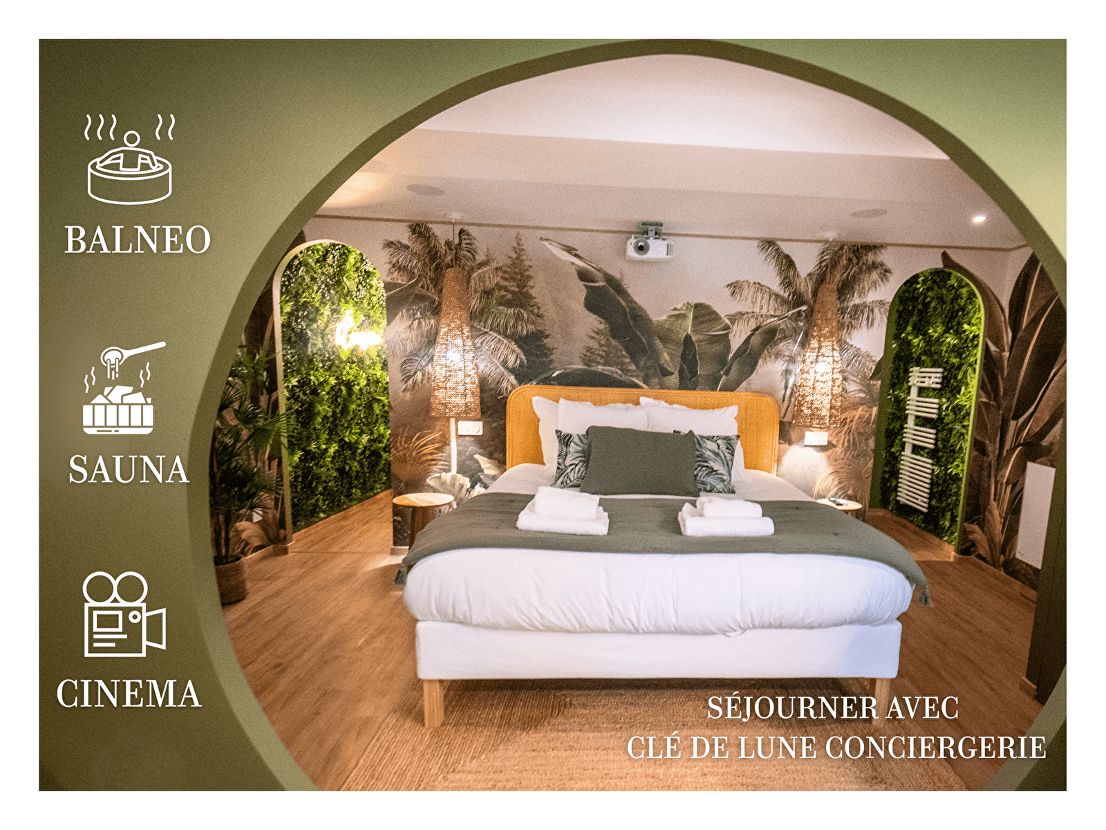 This suite, with its private whirlpool spa, sauna and video projector, invites you to relax in a warm, green setting. Perfect for a romantic getaway, an unusual night or a moment out of time.