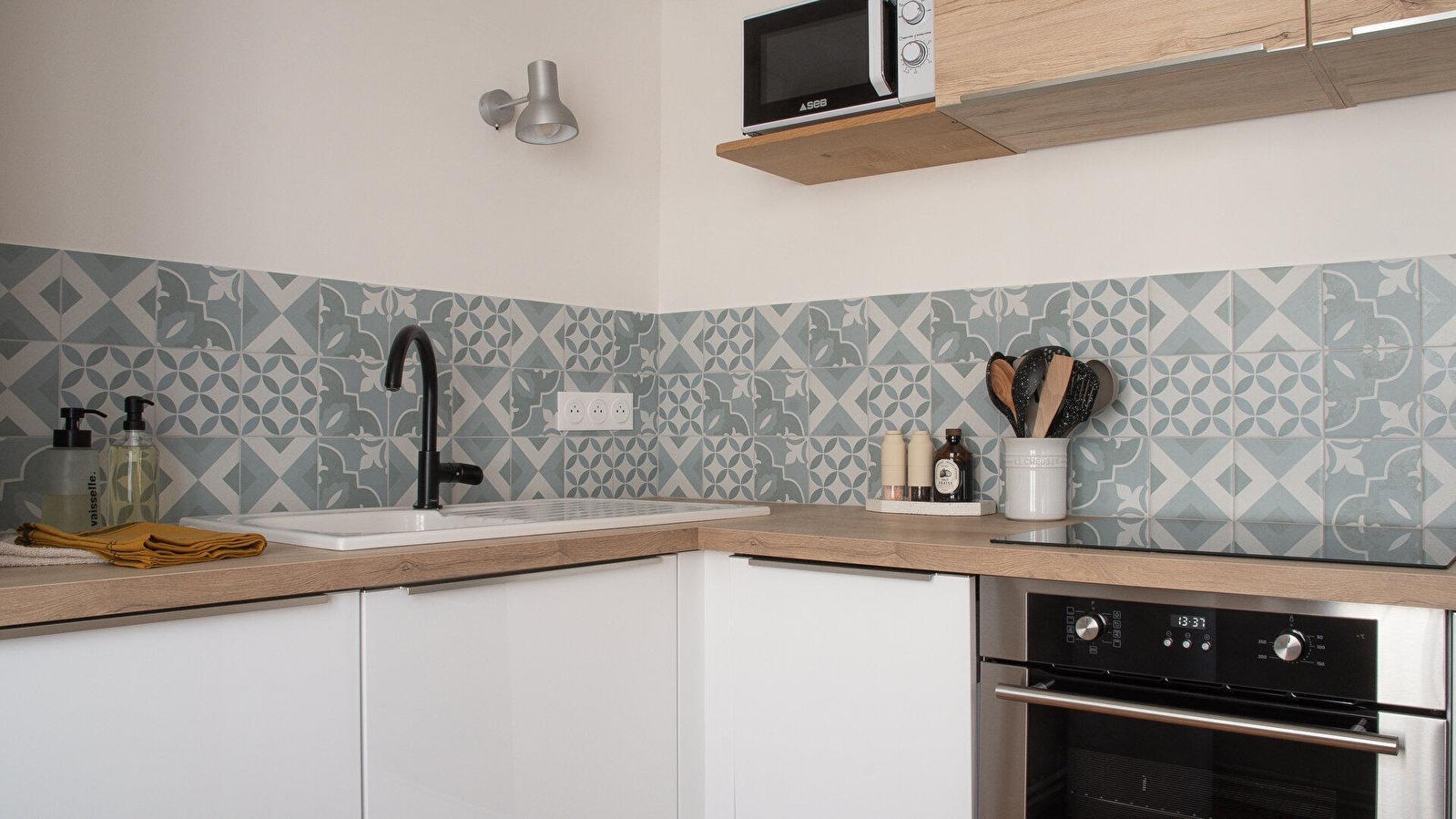 It consists of a living room with a fully equipped kitchen and a lounge with sofa and TV. On the first floor, the shower room with WC and the bedroom with a double bed (160x200). For your comfort, the bed will be made on your arrival and the bathroom linen is provided.
