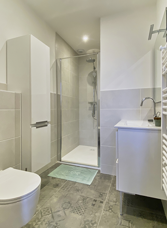 Bathroom with storage unit, shower and wall-hung toilet.