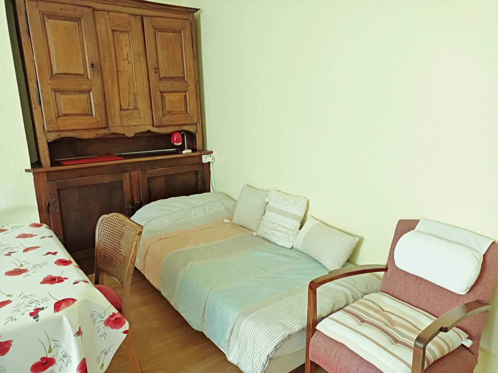 The Saint André is a bright furnished apartment for 3 people, with an uninterrupted view of Fort Saint André. It has a spacious living room with a 90 cm extra bed, a large bedroom with a 140 cm bed and storage space. The kitchenette is functional and well-equipped. Located on the 3rd floor, it is accessible via a stairlift on the first two levels.
