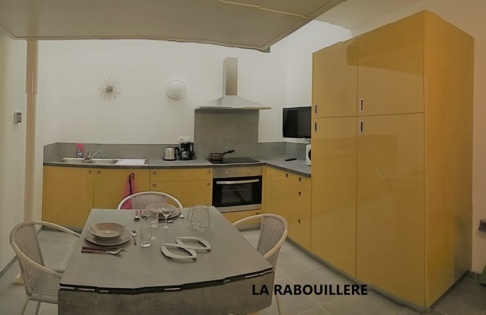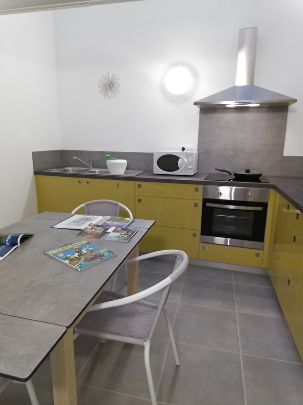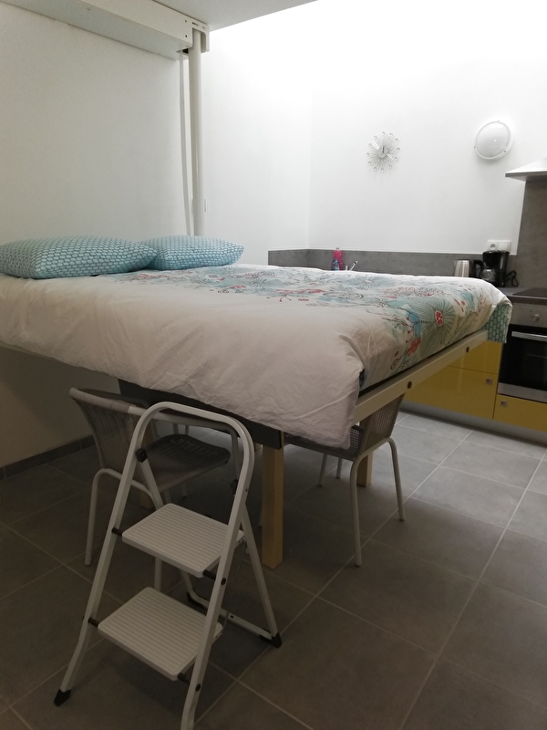 The studio comprises a 13m² room with a fitted kitchen and a 140x190 pull-out bed, which descends from the ceiling to a height of 1 metre, and a shower room (shower, washbasin, WC). It is lit by two velux windows.