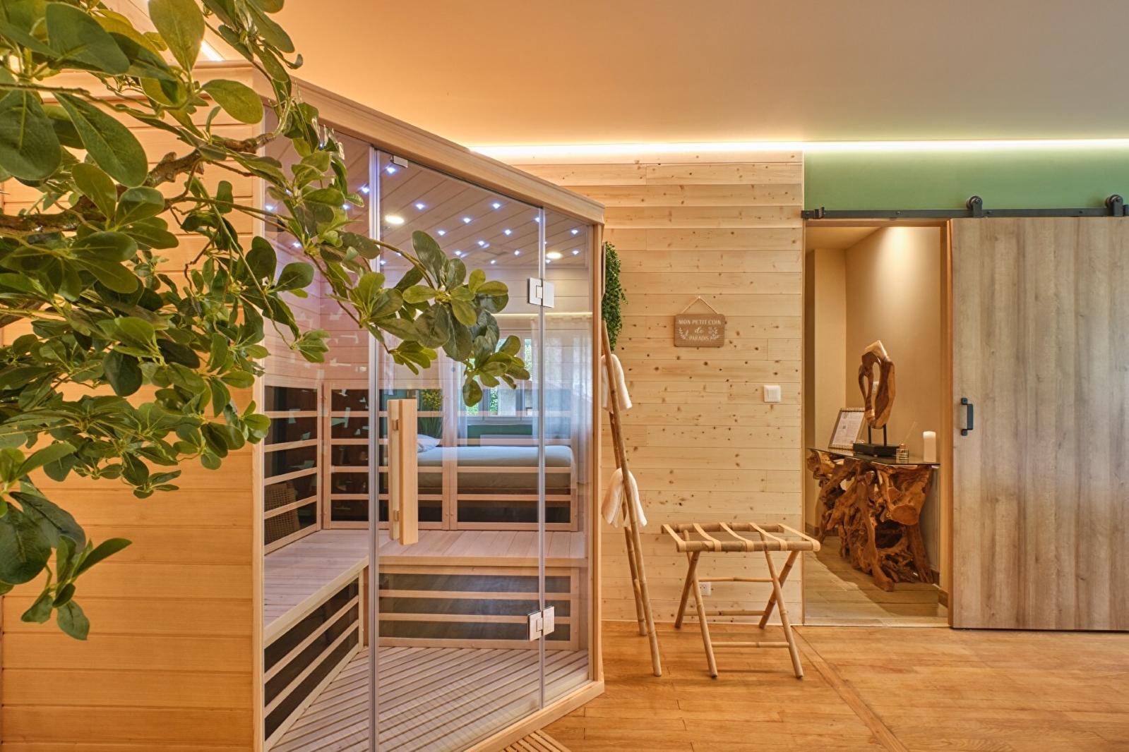 Enjoy a rare wellness area, equipped with an exclusive anatomical profile balneotherapy bathtub and a large sauna, for unforgettable moments of relaxation. The apartment also features a comfortable living room with a TV connected to Netflix, as well as a small, fully-equipped kitchen, allowing you to enjoy home-cooked meals and total autonomy during your stay.