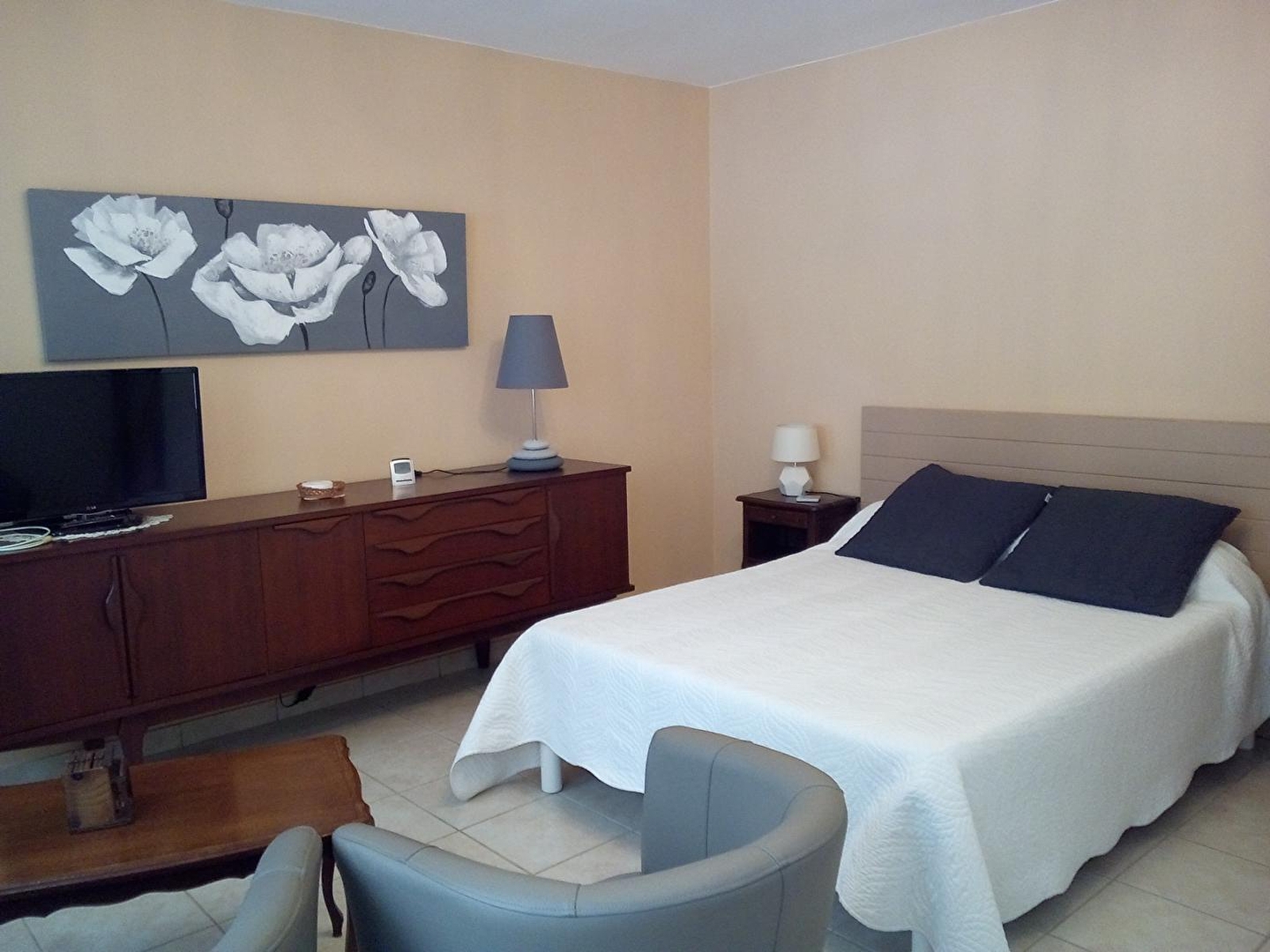 Accommodation on the ground floor of the owners' house. Kitchen, 1 bedroom with 1 double bed and 1 single bed, shower room with wc, washing machine, adjoining unfenced garden, courtyard, garden furniture. Central heating. Private parking on site.