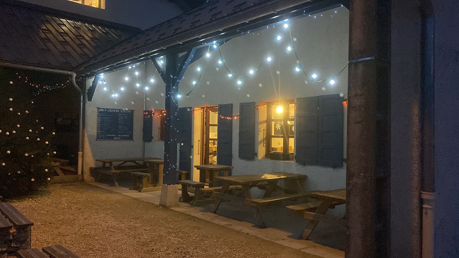 Le midi, une formule rapide est disponible, incluant des galettes, des crêpes, des pâtes avec des sauces variées comme pesto, forestière ou bleu de Gex, ainsi que des glaces pour se rafraîchir. En saison, vin chaud et jus de pomme chaud sont également proposés pour accompagner votre repas.