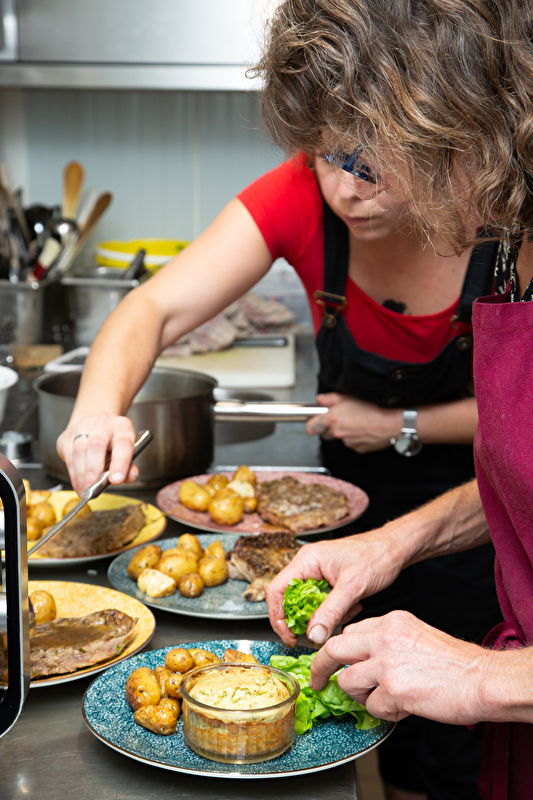 All our meat (beef, veal, pork and goat) comes from animals reared in the open air on our meadows and is certified organic. Vegetables, flour and cheese are also produced on our farm.
