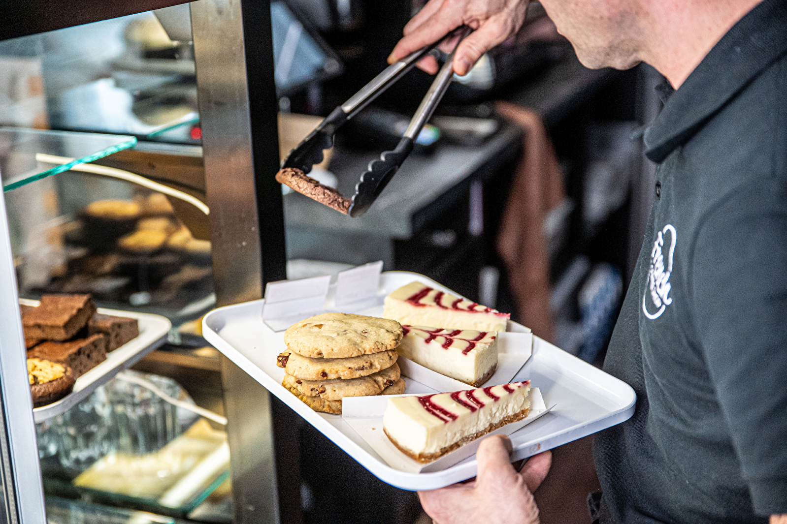 A selection of gourmet pastries (doughnuts, muffins) and a range of quick savoury snacks (ciabattas, croque-monsieur) are available to accompany the coffee.