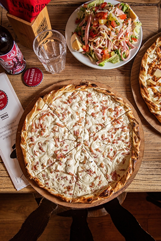 Here, home-made Flammekueches are prepared in the purest tradition, using authentic know-how and products carefully selected from Alsatian and local producers. They come in a variety of flavours, from the most traditional to the most gourmet!