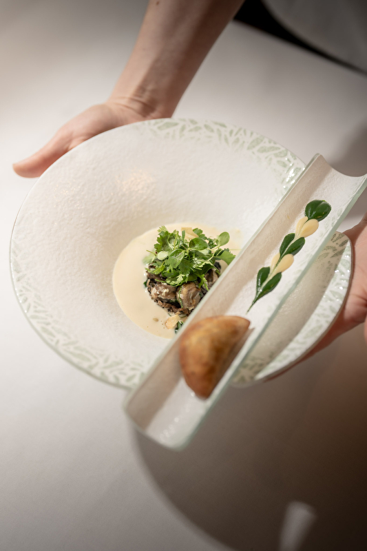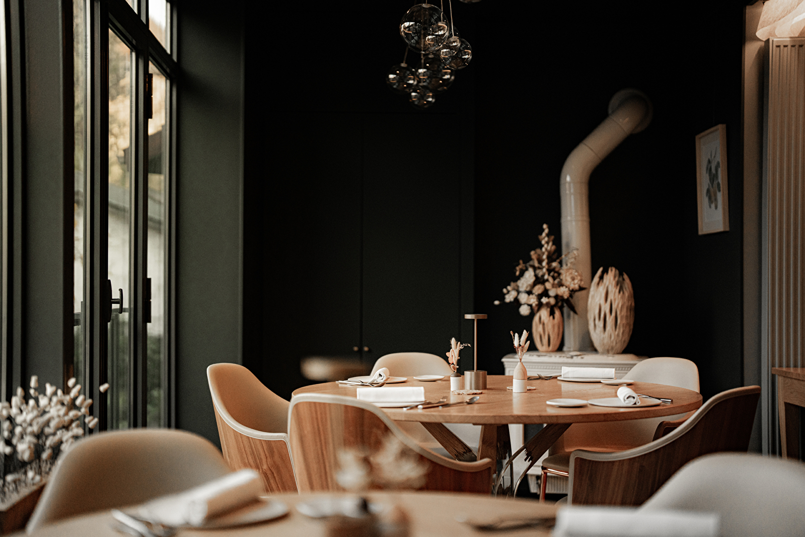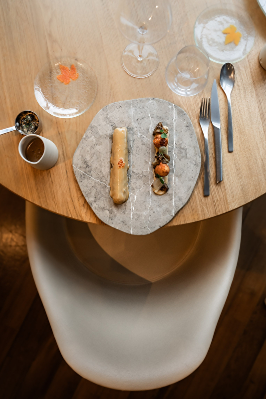 Here, everything is designed to make you feel at home: the wood enveloping the dining room, the soft light, the nearby river, the hand-crafted crockery, the knives carved from stone, the silence of the kitchens from which a cuisine full of life emerges.