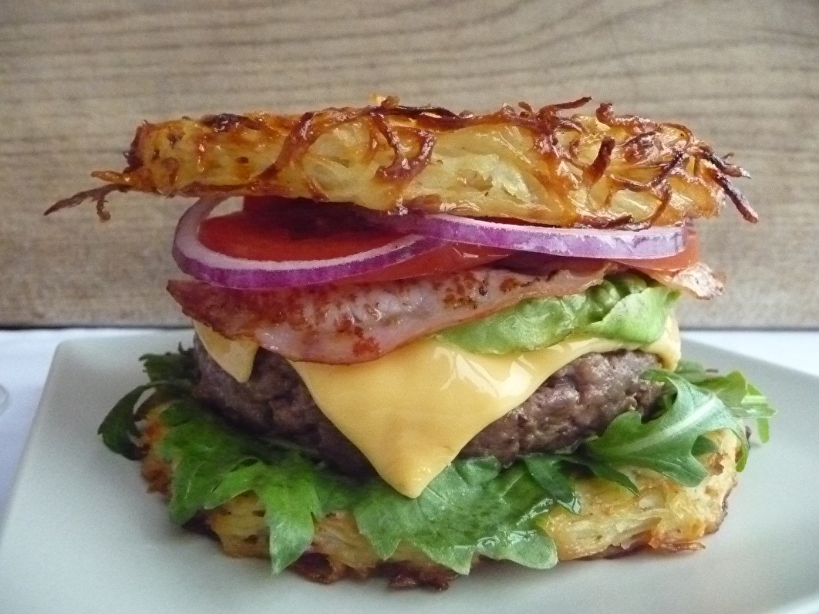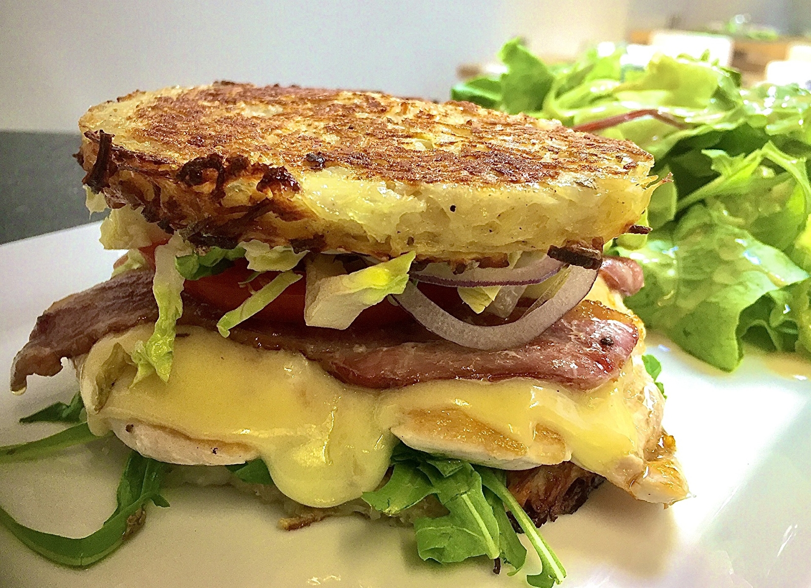 Discover the gourmet burger revisited without bread, replaced by two crispy and soft potato patties "Les criqs'". Burgers are topped with minced Charolais beef, duck breast, salmon bomlo..., AOC cheeses and homemade sauce.