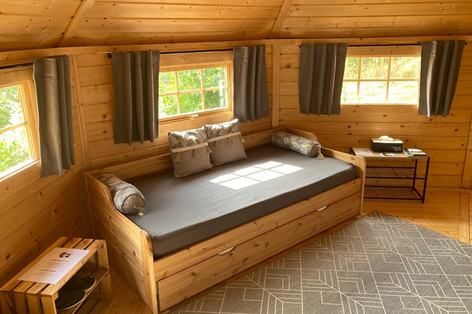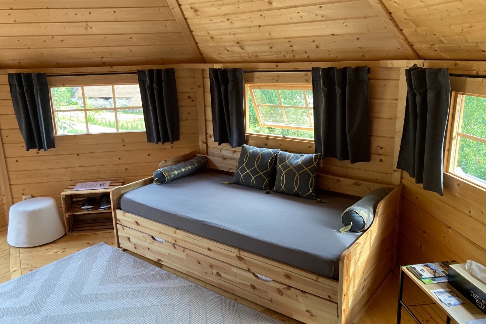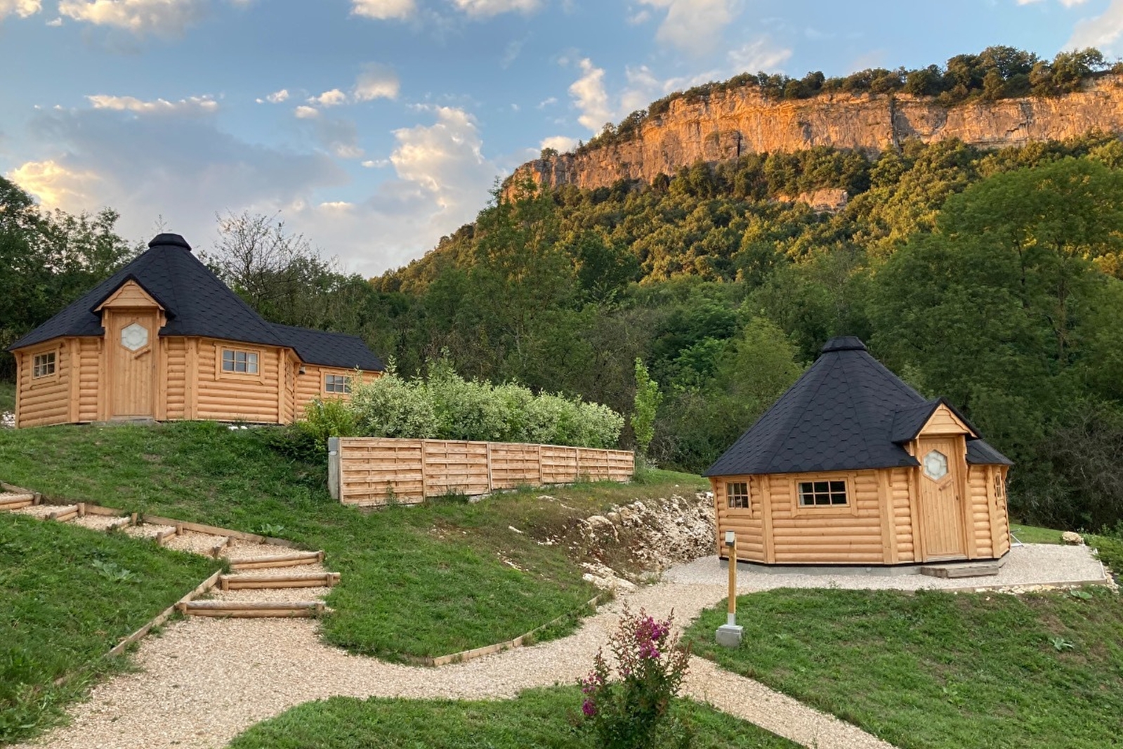 We offer bed and breakfast accommodation (breakfast included) to provide all the comforts and facilities you need (bed linen and towels included) for a cocooning break. On arrival, we'll welcome you in our double kota, where you'll also have breakfast every morning. Bicycle tourists can park their bikes in a secure garage. You can choose from our 5 kotas, which can accommodate from 2 to 4 people per kota. Each kota has 2 rooms including a bedroom and a bathroom. All our Kotas are equipped with a double bed (160 * 200). Two of the Kotas are also equipped with a trundle bed (90 * 190) to accommodate an additional 2 people in the family room. The bathrooms feature a walk-in shower, WC and washbasin. Reversible air-conditioning is installed in all bedrooms. A non-sac room is also available for cyclotourists to eat indoors during inclement weather. The site is close to a number of tourist attractions. It is 400 meters from the ViaRhôna route, 1km from the Maison d'Izieu, 3kms from the Exo 3D water sports center, 4kms from the Glandieu waterfall and 7kms from the Walibi park. Nearby, there's a bakery and mini-market 600 m away, and 2 restaurants 1 km away, all within walking distance along the ViaRhôna along the Rhône. The site is also bordered by a footpath leading up to the village of Izieu.