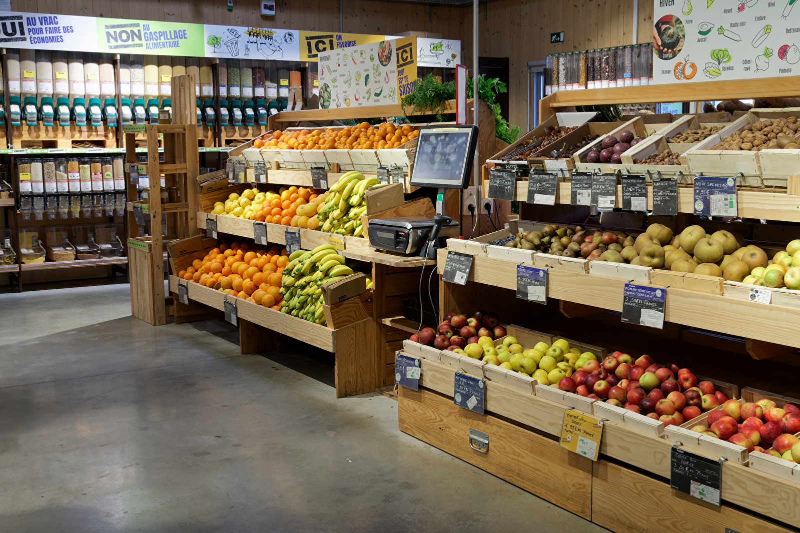 Our 420 m² Biocoop La Canopée shop in Valentin has been designed to meet the needs of local consumers and visitors alike. It offers a full range of sweet and savoury foods, a vast fresh produce area showcasing local organic produce, as well as sections dedicated to skincare, beauty, books and eco-products. You'll also find a wide selection of bulk products. True to our commitments, we work with over 80 local producers.