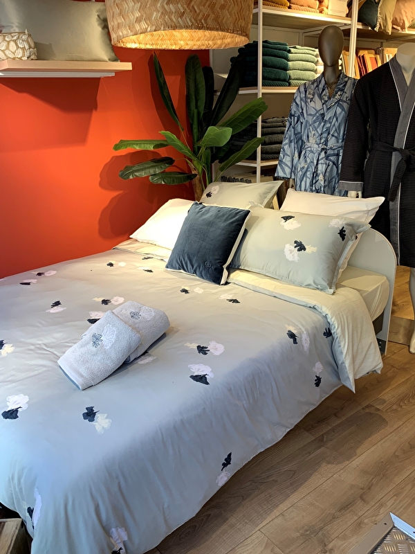 Sylvie and her new team are delighted to welcome you to their Olivier Desforges boutique. This well-known brand of top-of-the-range household linen brings a resolutely stylish atmosphere to your bedroom and bathroom, with a range that is both refined and modern. Hugo Boss home linen space.