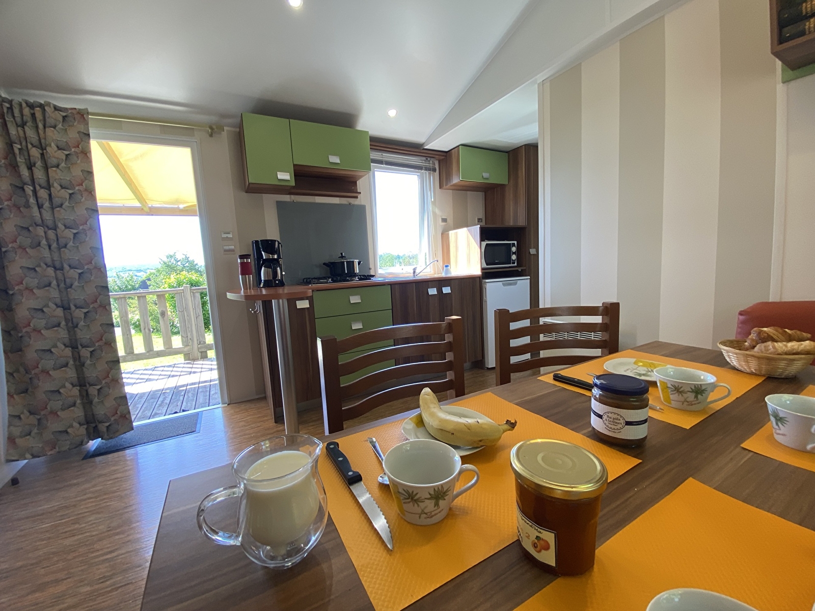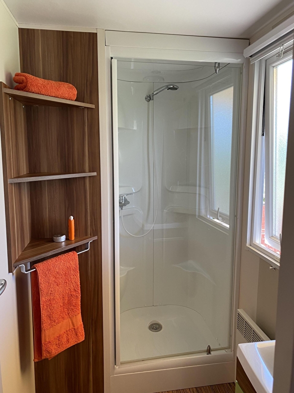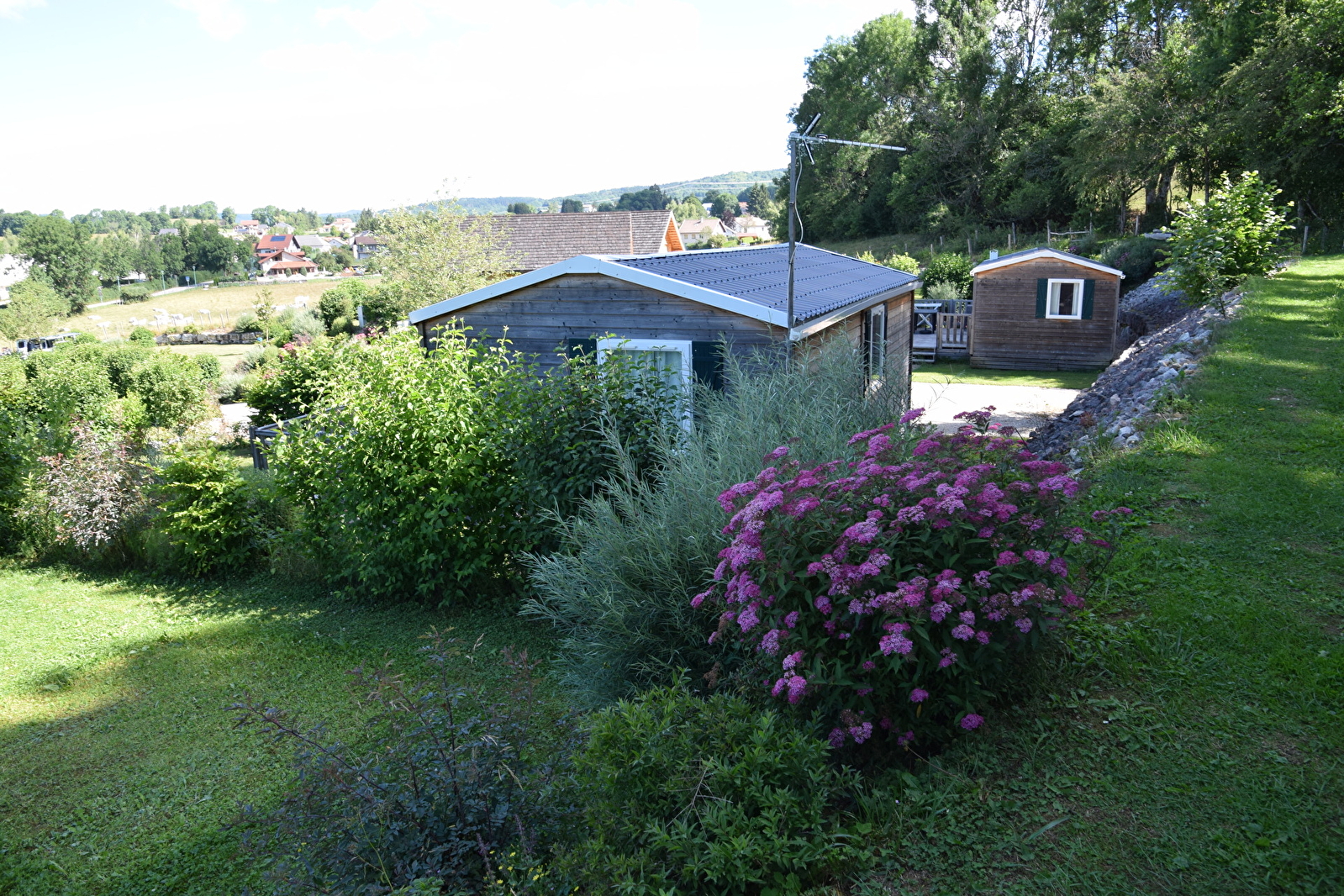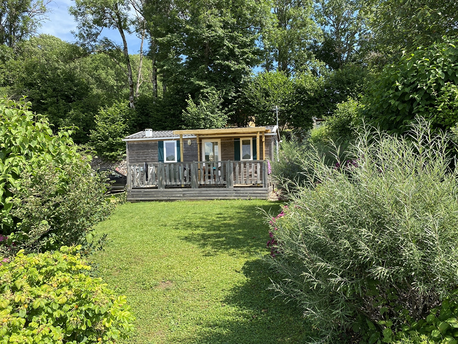 2 outdoor wooden mobile homes. IRM Super Mercure models, two bedrooms, separate wc, reinforced insulation and heating. Fully equipped, microwave, gas hob, fridge and television. 15m2 semi-covered terrace. Wifi available. Bookable for a minimum of 2 nights or by the week.