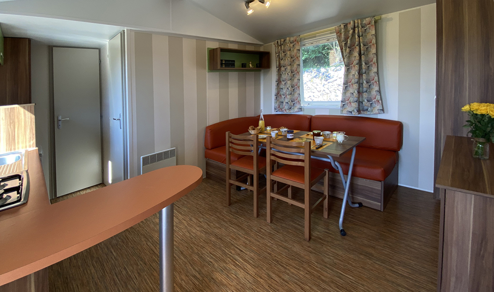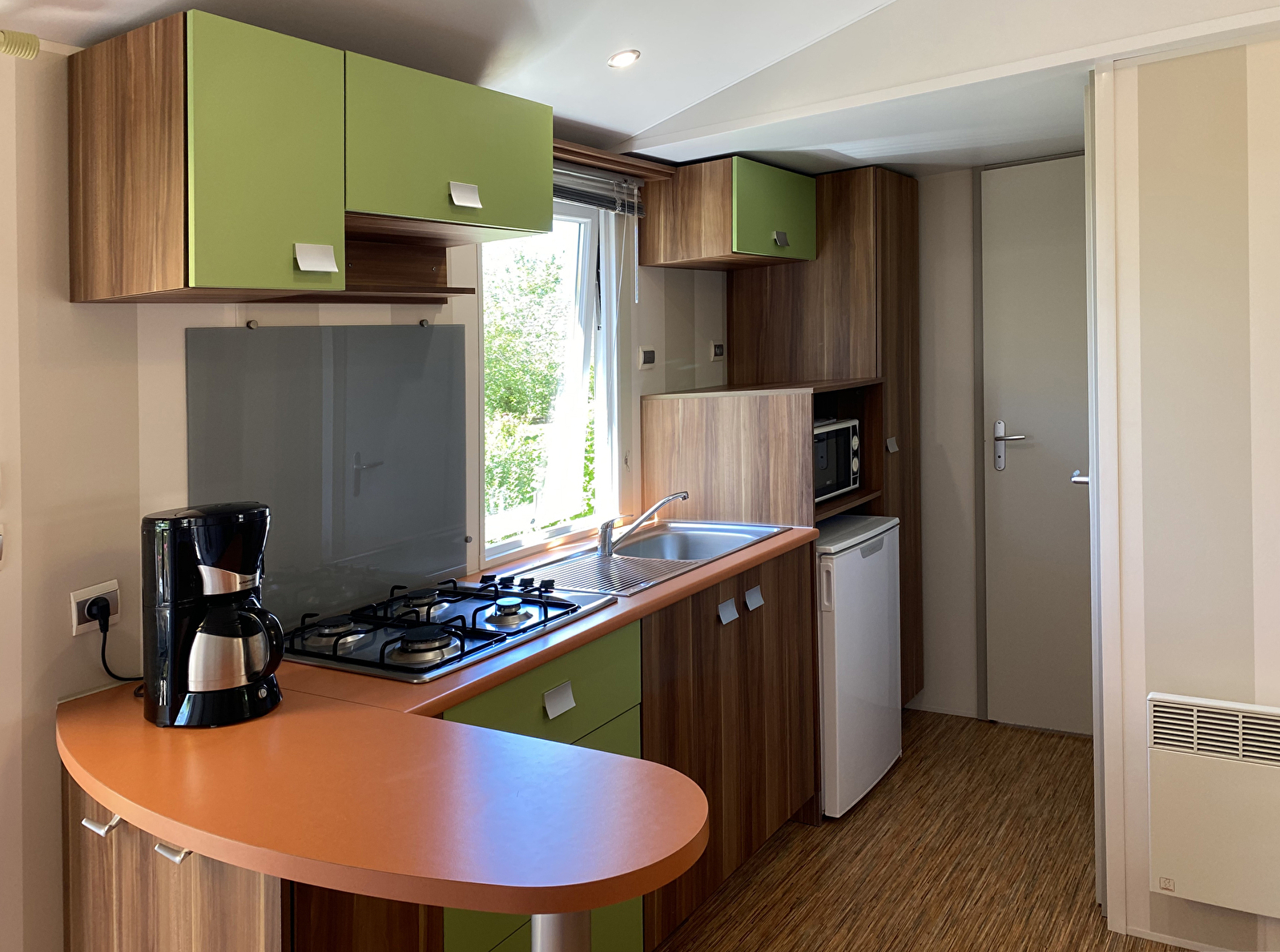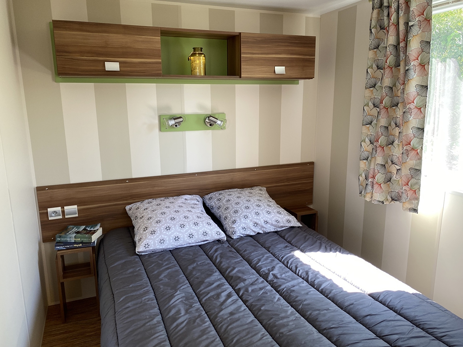 2 outdoor wooden mobile homes. IRM Super Mercure models, two bedrooms, separate wc, reinforced insulation and heating. Fully equipped, microwave, gas hob, fridge and television. 15m2 semi-covered terrace. Wifi available. Bookable for a minimum of 2 nights or by the week.