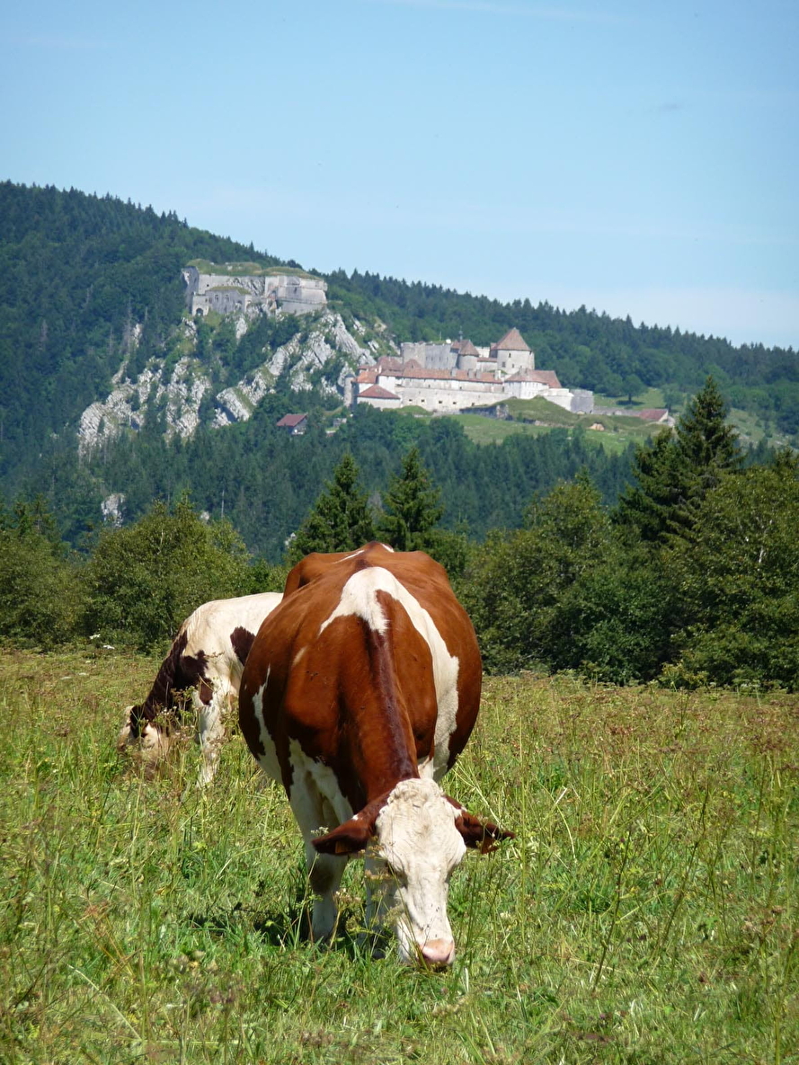 Vaches montbéliardes et derrière le Château de Joux Maud HUMBERT Bourgogne-Franche-Comte Tourisme