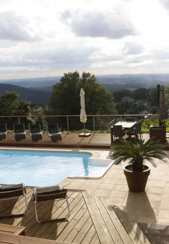 Between the Franche-Comté capital, Besançon, and the UNESCO-listed Royal Saltworks, the road winds its way up to a panoramic terrace from where this guesthouse and its swimming pool overlook the Doubs Valley.