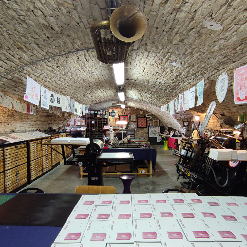 Affiche Moilkan works with wood and lead types, printing presses, linocuts and plays on words to make posters. You can discover this work during a visit. The workshop is also a place where you can learn typography and linocut.