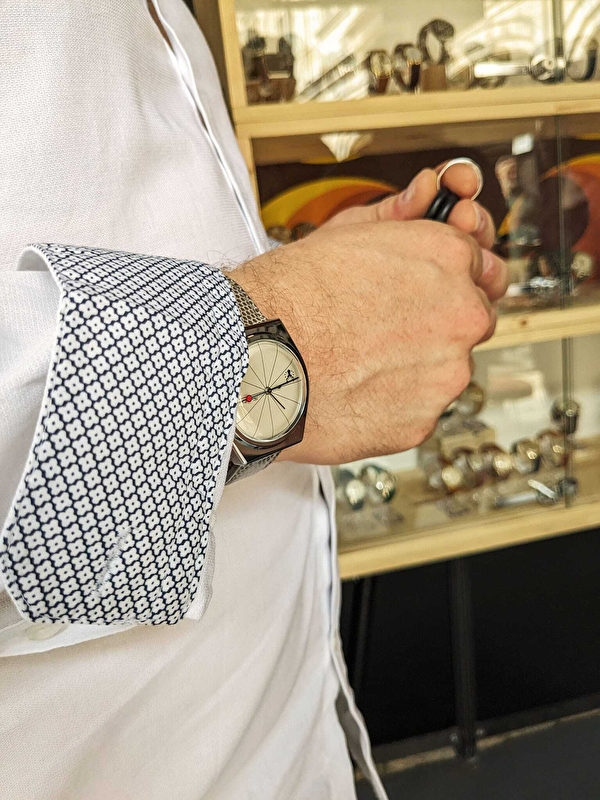 As well as repairs, the workshop is distinguished by its innovative approach to design. The craftsman is developing his own brand, Thomas Karbiche, based on the concept of watchmaking upcycling, transforming old components into unique contemporary pieces.