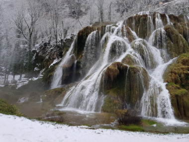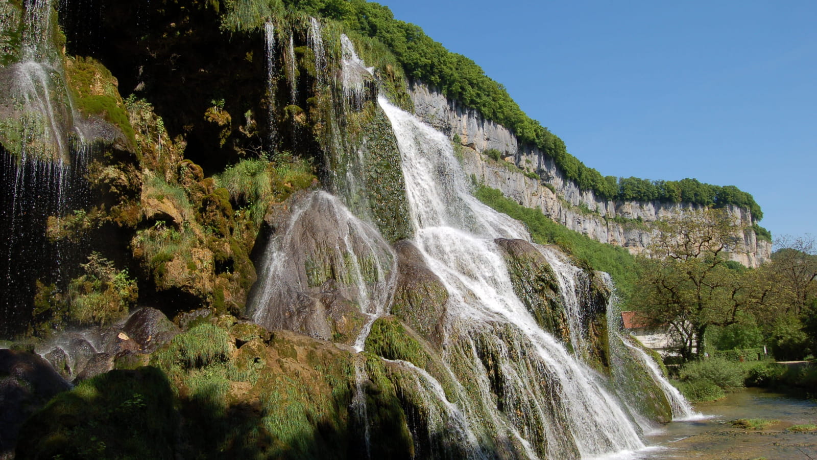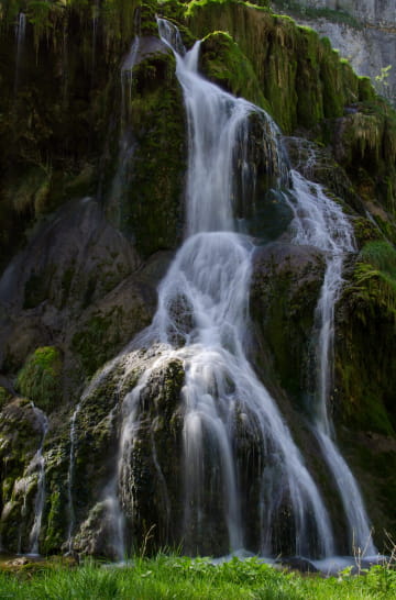 Located at the bottom of the Baume-les-Messieurs steephead valley, one of the most famous in Jura, this waterfall is remarkable in many ways. It is fed by the Dard, an underground river that emerges after raging through subterranean caves.