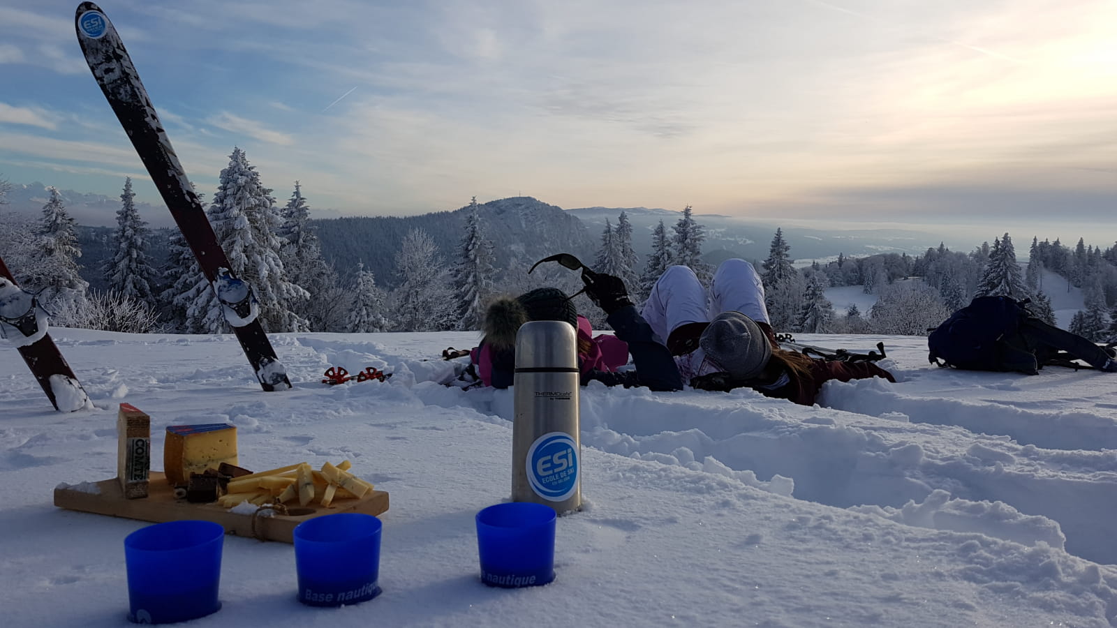 Rewarded for your efforts, as the saying goes! After a good hour's climbing, we're able to enjoy the panoramic view with a nice cup of tea and some Jura Mountain cheese.