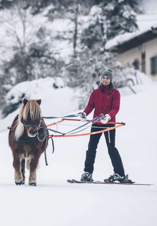 The snow-covered meadows invite both children and adults to try ski-joering for the very first time.