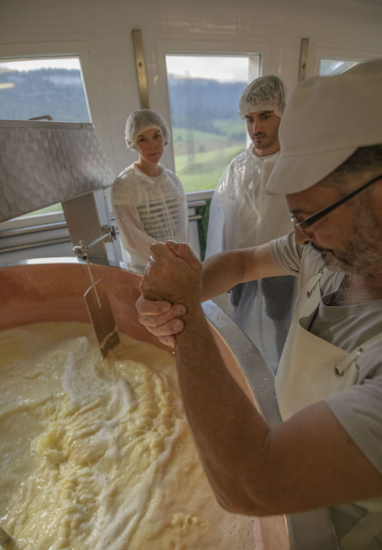 In this cheese dairy that is very characteristic of the mountains here, the traditional Comté cheese is made every morning. They also produce other local cheeses from our mountains such as Morbier and Mont d'Or.