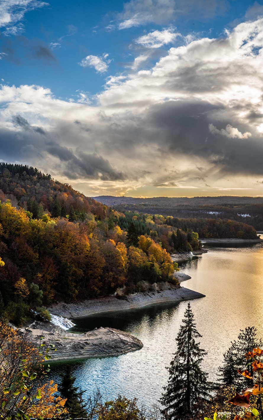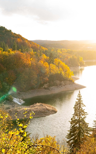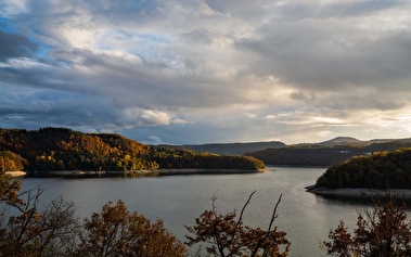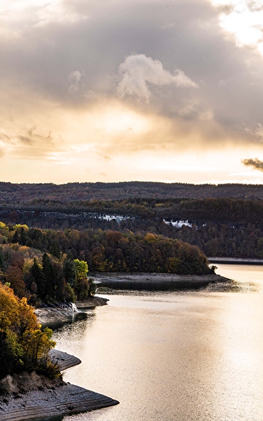 The view of the vast Vouglans lake down below, bordered by forests in blazing autumn colours, is quite simply magical!